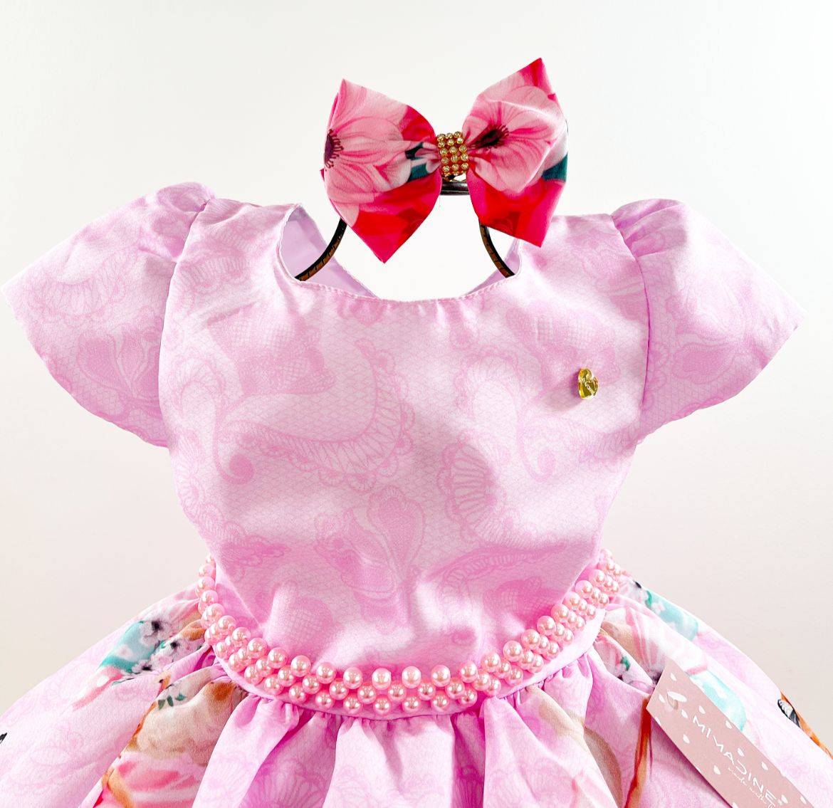 Vestido infantil manga curta,peito de renda. Cintura com pérolas sintéticas, saia com acabamento de babado e estampa floral, elástico nas costas ajustável ao corpo e laço. Acompanha 1 bico de pato.