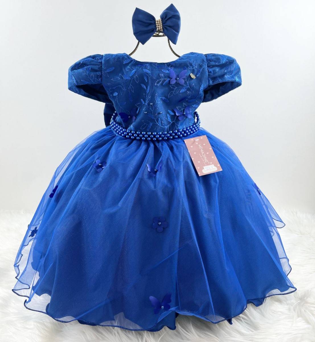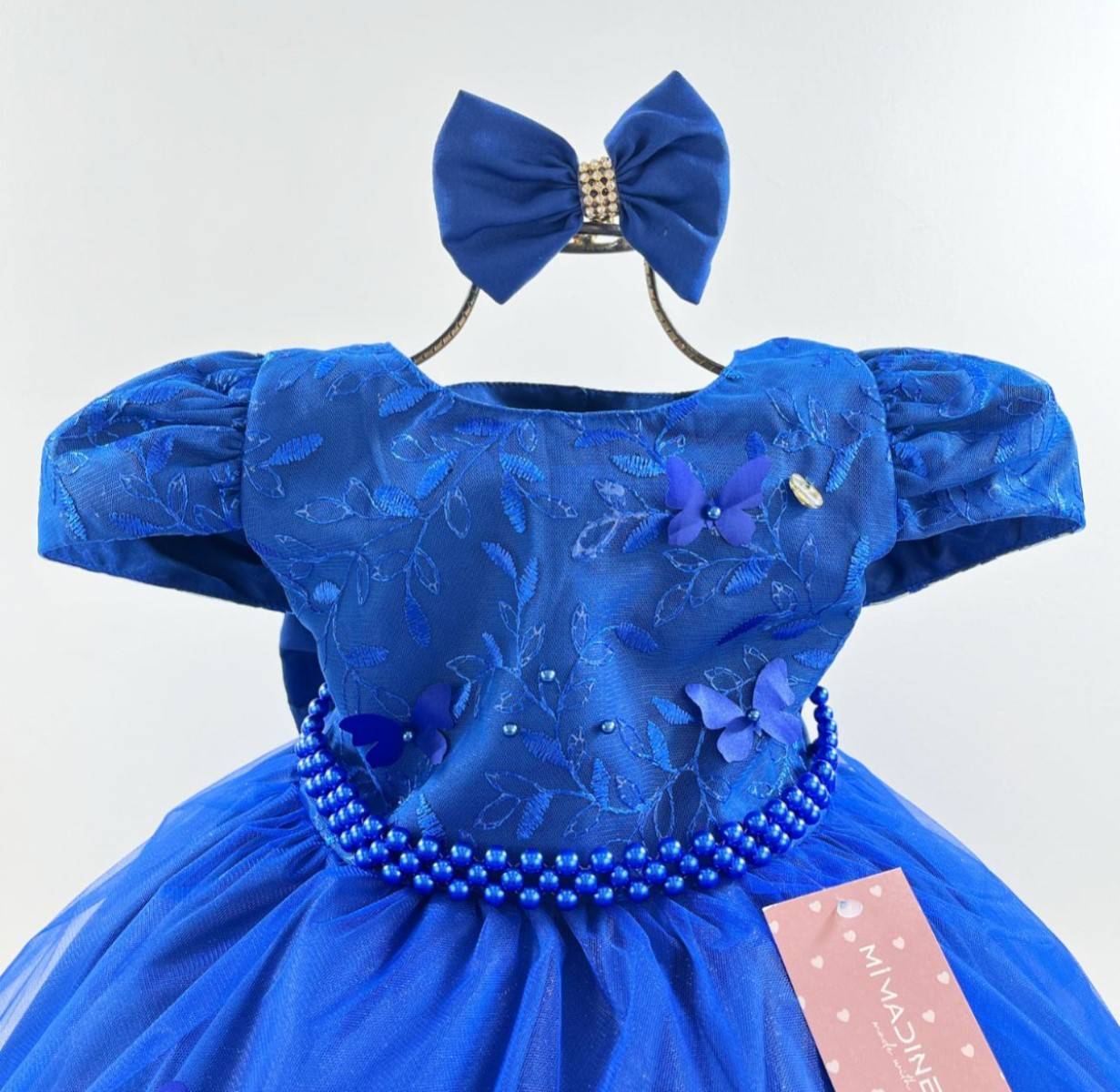 VESTIDO MANGA CURTA COM FORRO, PEITO COM RENDA COM DETALHES DE BORBOLETAS, CINTURA COM PÉROLAS SINTÉTICAS,SAIA FRISADA. ELÁSTICO NAS COSTAS AJUSTÁVEL AO CORPO E LAÇO. ACOMPANHA 1 BICO DE PATO.