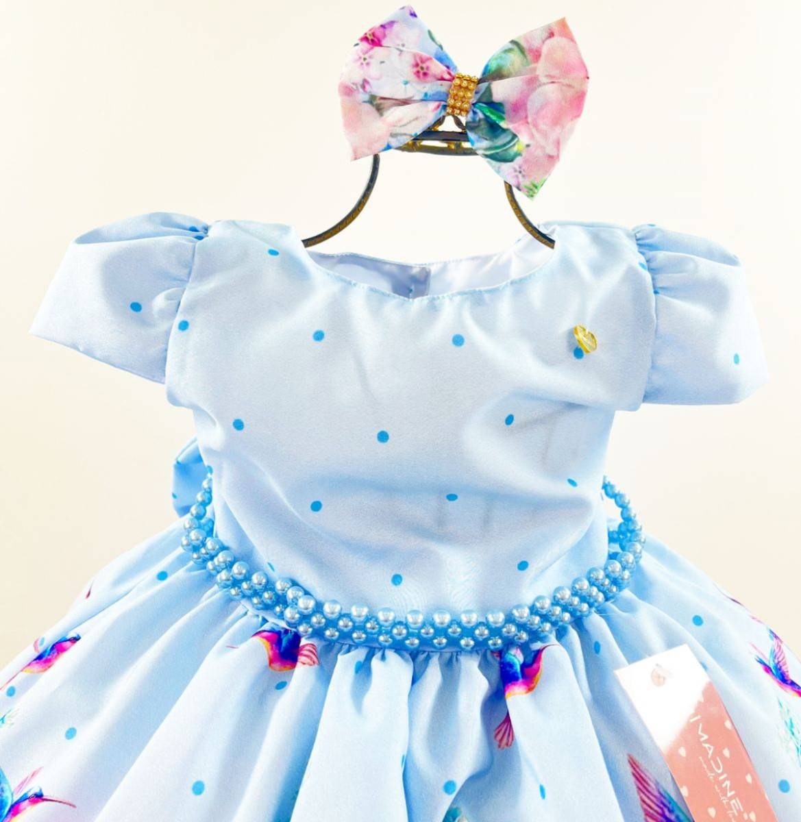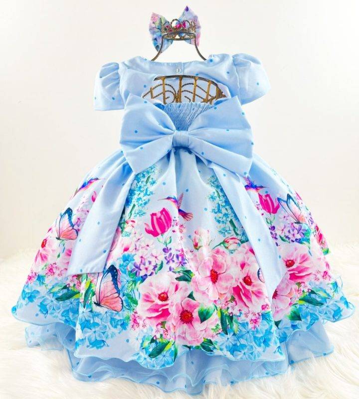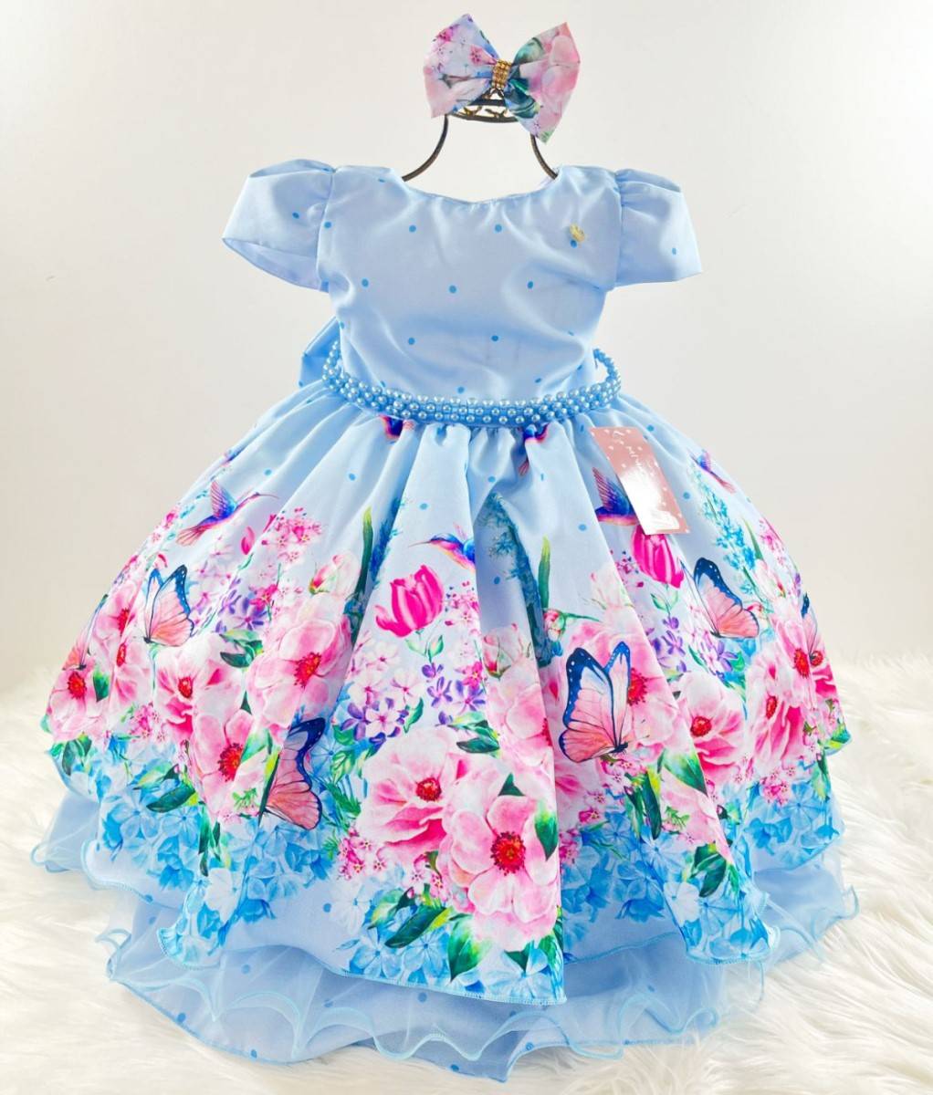 Vestido infantil manga curta, estampa floral com borboletas. Cintura com pérolas sintéticas, saia com acabamento de babado, elástico nas costas ajustável ao corpo e laço. Acompanha 1 bico de pato