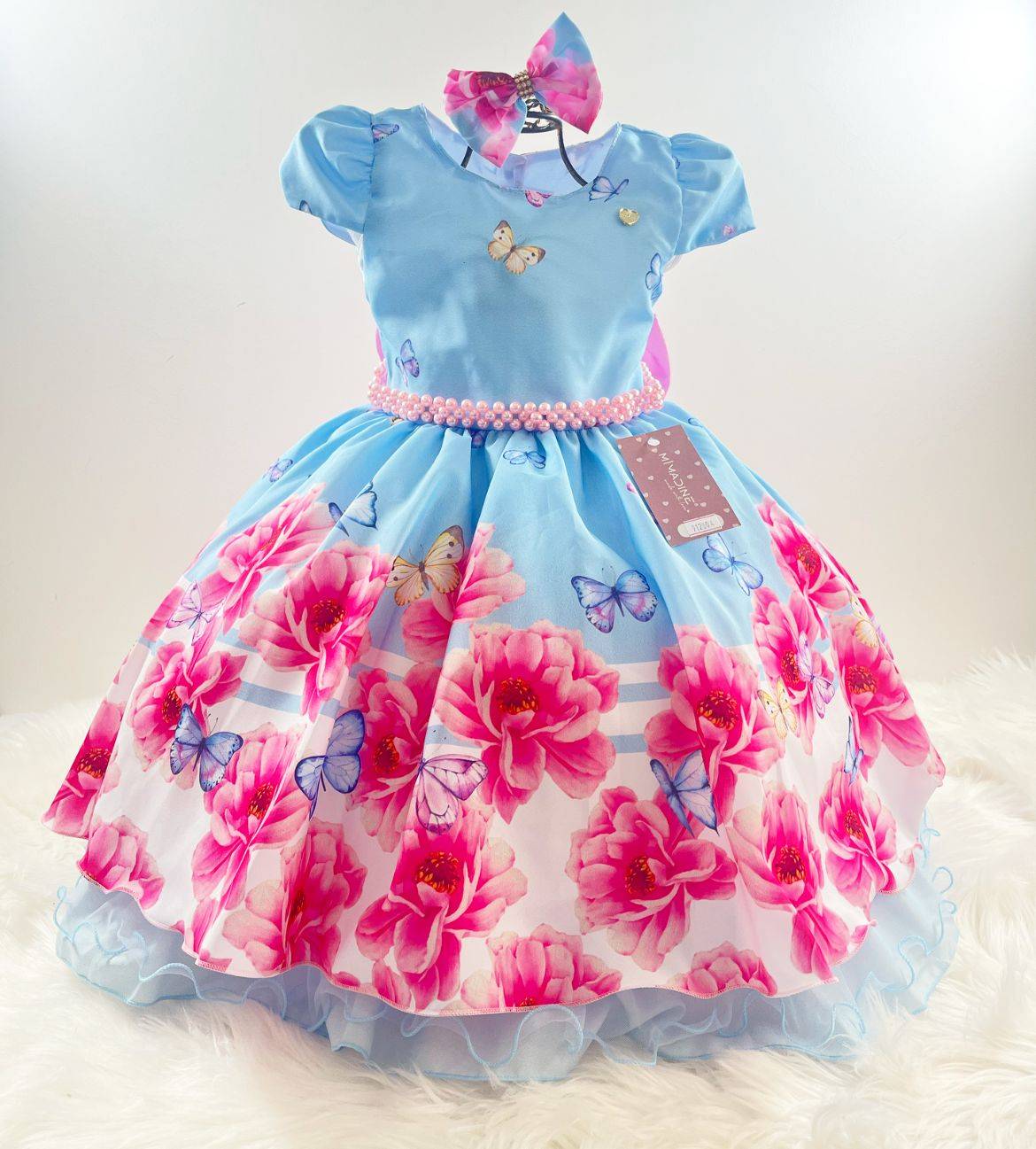 Vestido infantil manga curta, estampa floral. Cintura com pérolas sintéticas, saia com acabamento de babado, elástico nas costas ajustável ao corpo e laço. Acompanha 1 bico de pato