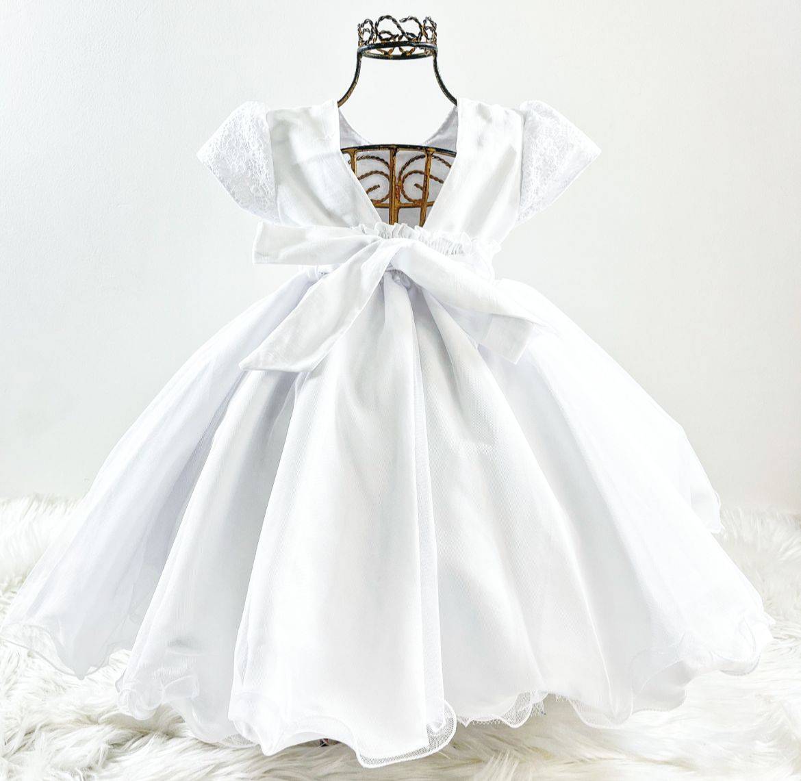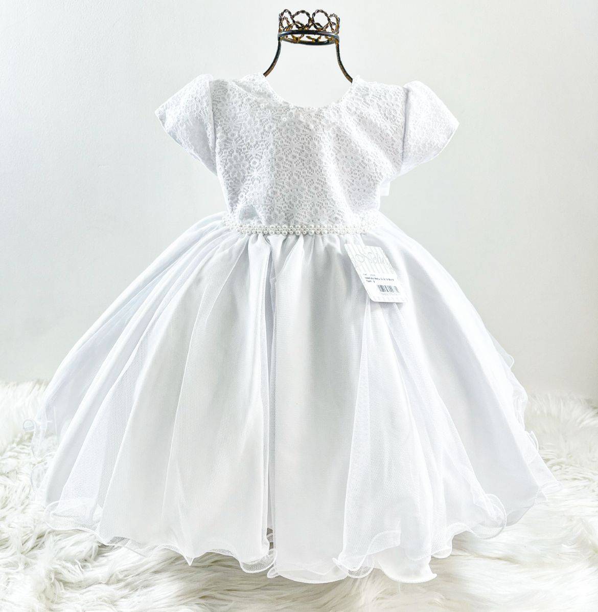 Vestido infantil manga curta, peito com renda. Cintura bordada com pérolas sintéticas, saia lisa com uma camada de tule, elástico nas costas ajustável ao corpo.