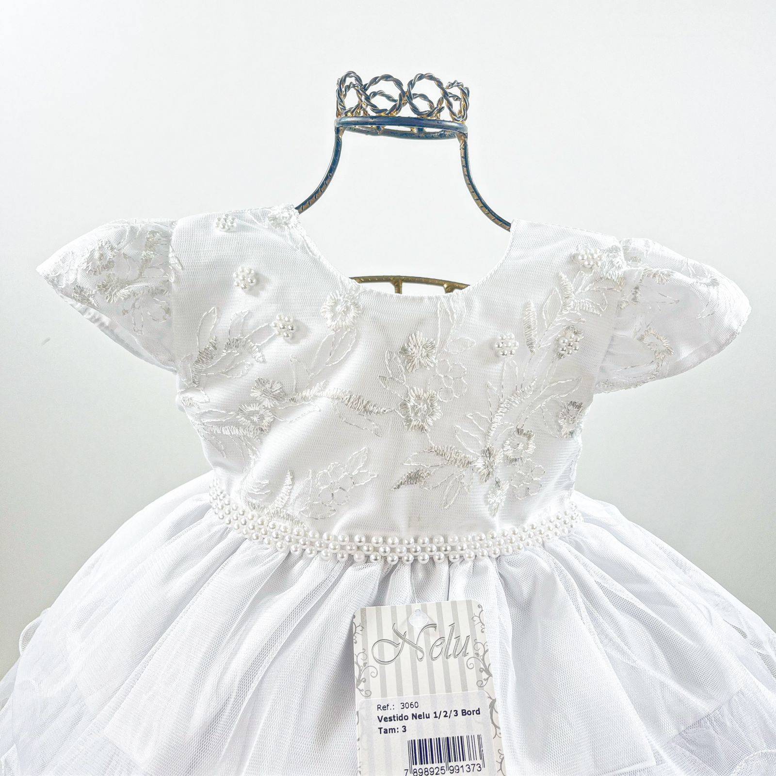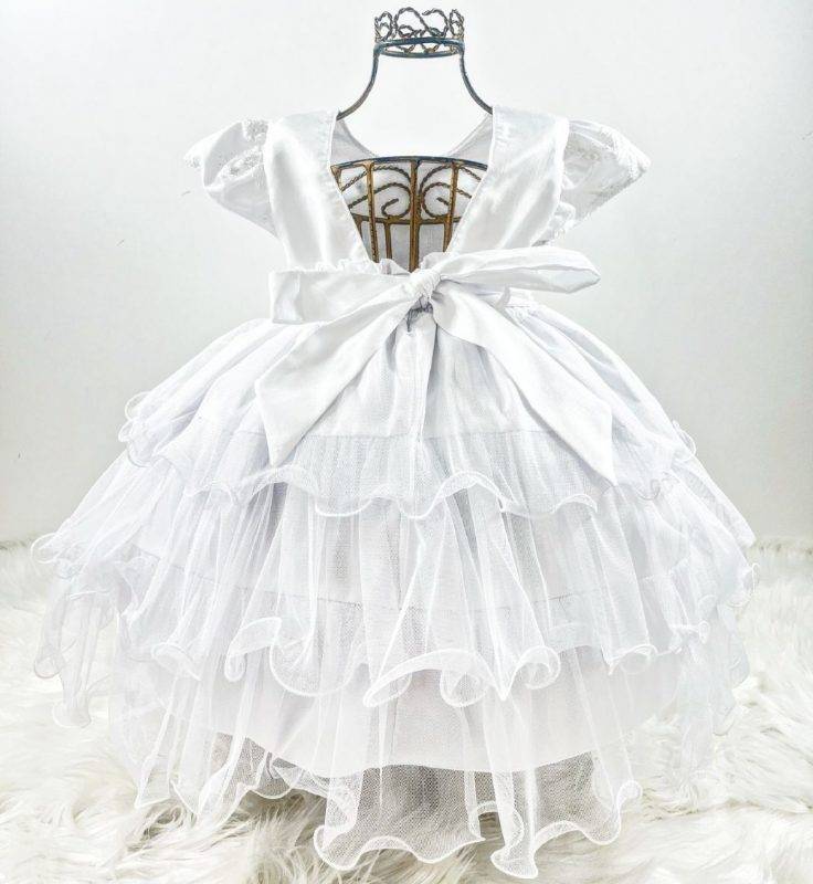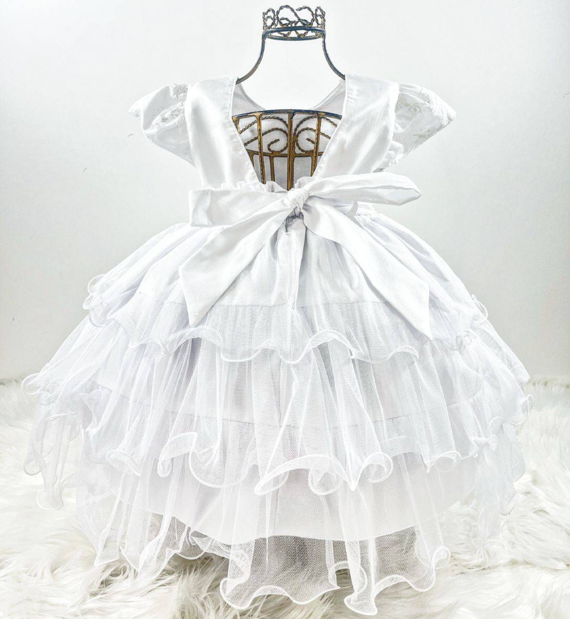 Vestido infantil manga curta , peito bordado com renda e pérolas sintéticas, cintura bordada com pérolas sintéticas. Saia de babado Elástico nas costas ajustável ao corpo e faixa para melhor ajuste.