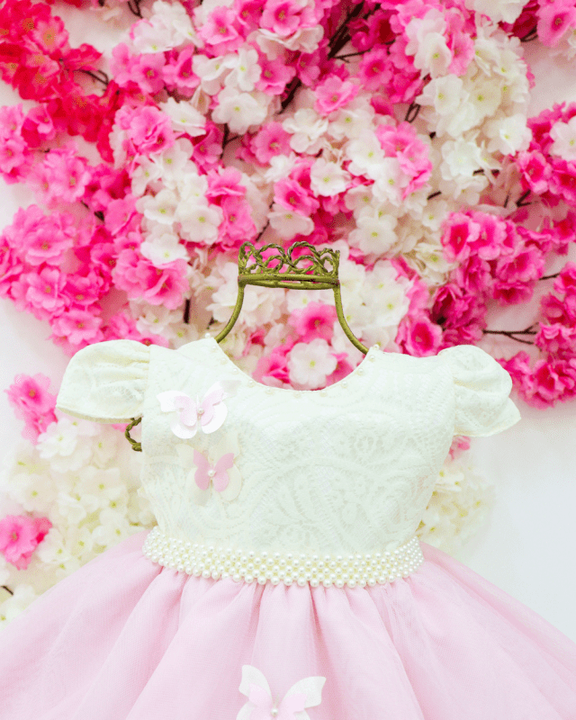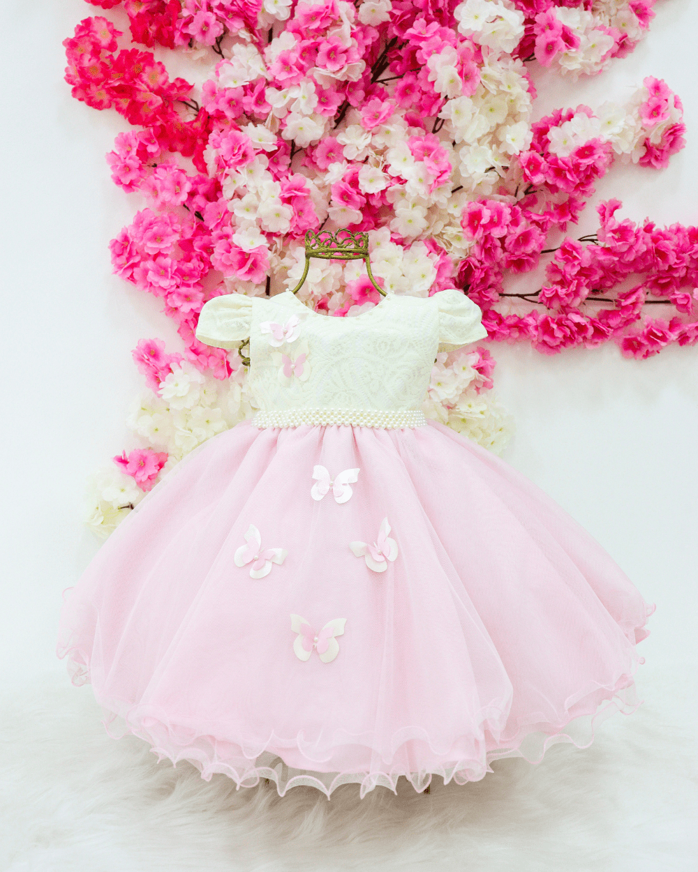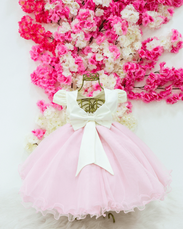 Vestido Nelu, vestido manga curta com cinto de pérolas, peito rendado, saia de em tule costas semi aberta e laço removível.