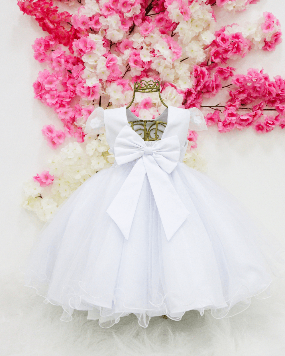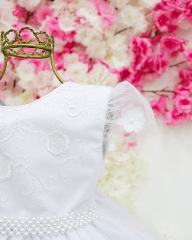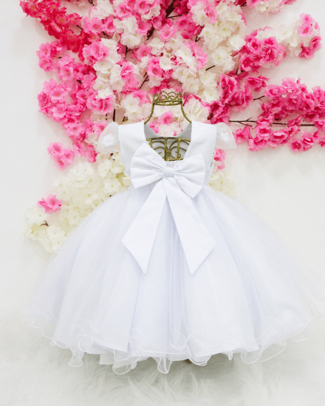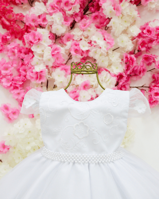 Vestido, manga curta, super delicado saia em tule, cinto de pérolas e costa elástica para melhor ajuste ao corpo.