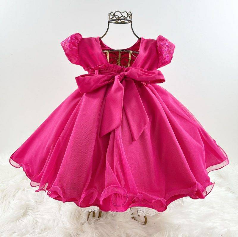 Vestido infantil manga curta, peito com renda com detalhes de pérolas sintéticas. Cintura bordada com pérolas sintéticas, saia lisa com uma camada de tule, elástico nas costas ajustável ao corpo.