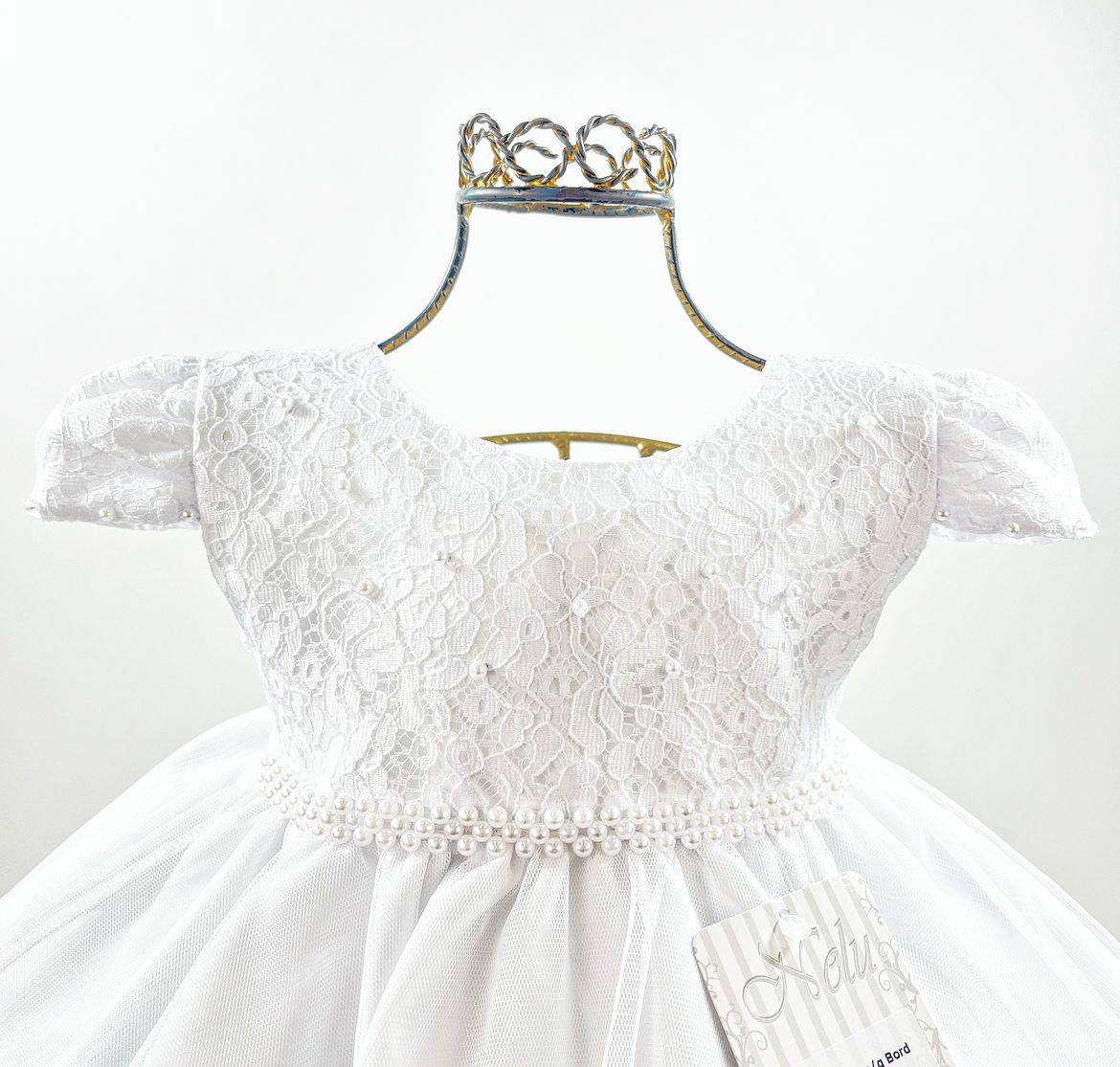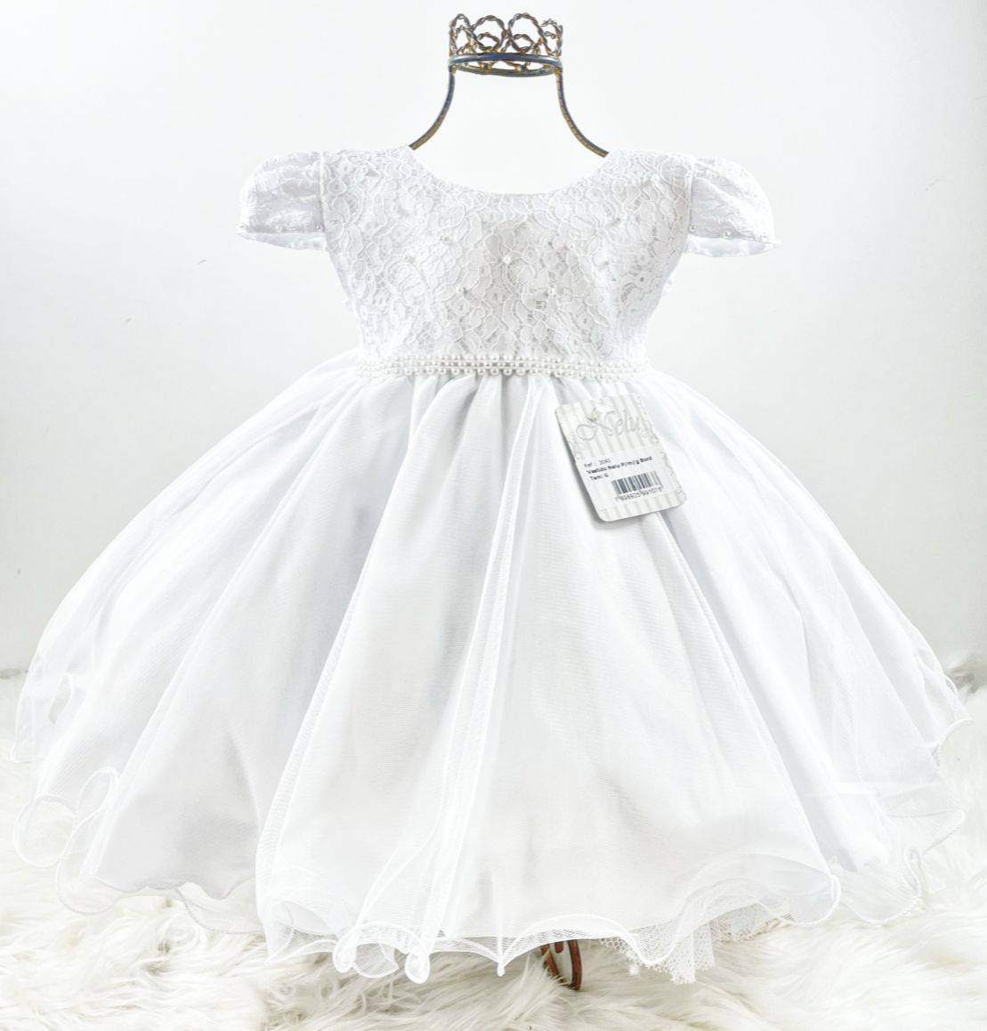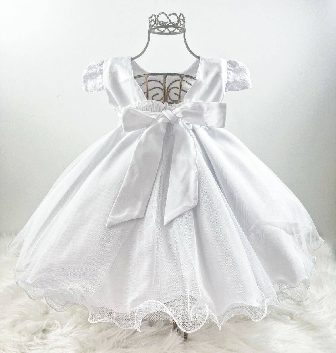 Vestido infantil manga curta, peito com renda e pérolas sintéticas . Cintura bordada com pérolas sintéticas, saia lisa com uma camada de tule, elástico nas costas ajustável ao corpo.