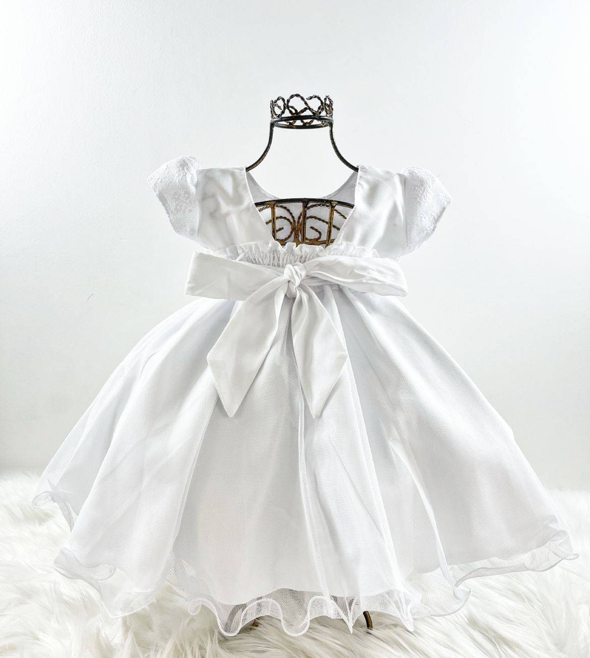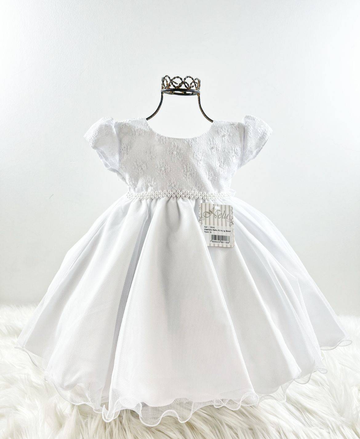 Vestido infantil manga curta, peito com renda e pérolas sintéticas. Cintura bordada com pérolas sintéticas, saia lisa com uma camada de tule, elástico nas costas ajustável ao corpo.