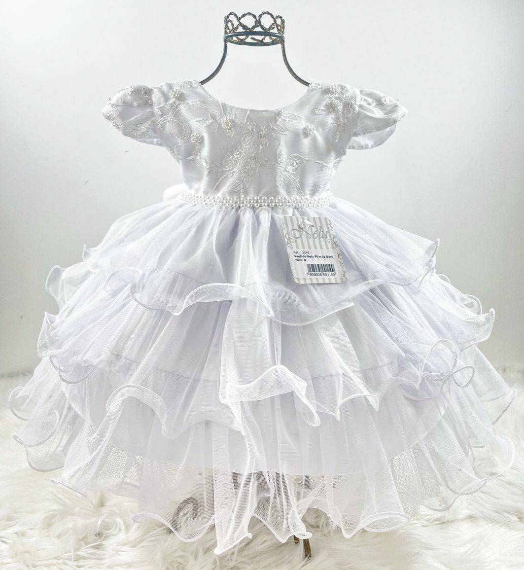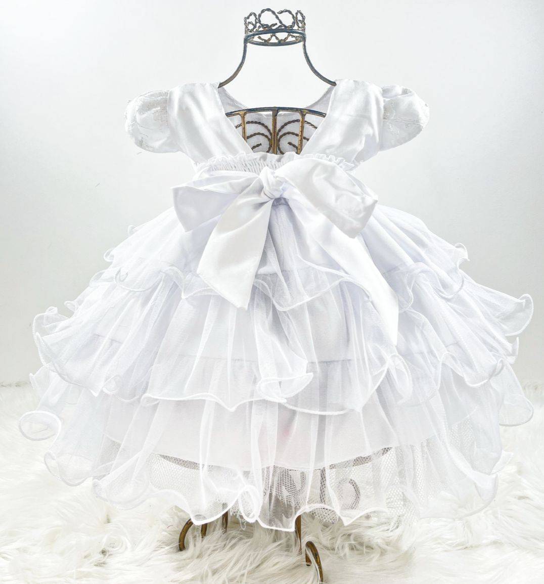 Vestido infantil manga curta , peito bordado com renda e pérolas sintéticas, cintura bordada com pérolas sintéticas. Saia de babado Elástico nas costas ajustável ao corpo e faixa para melhor ajuste.