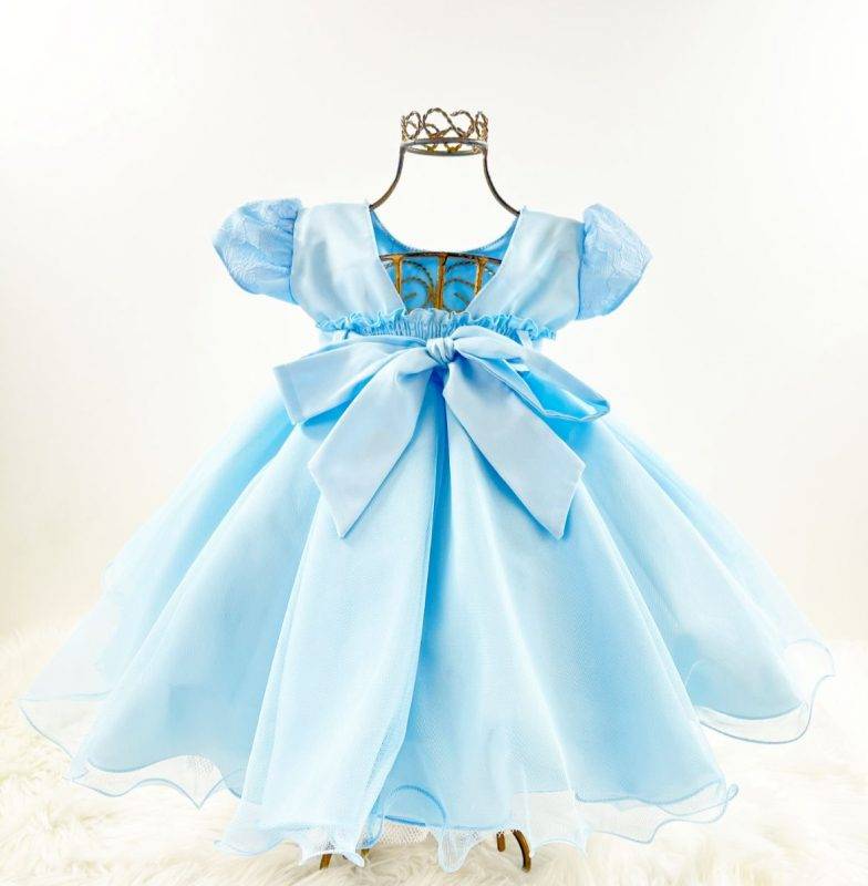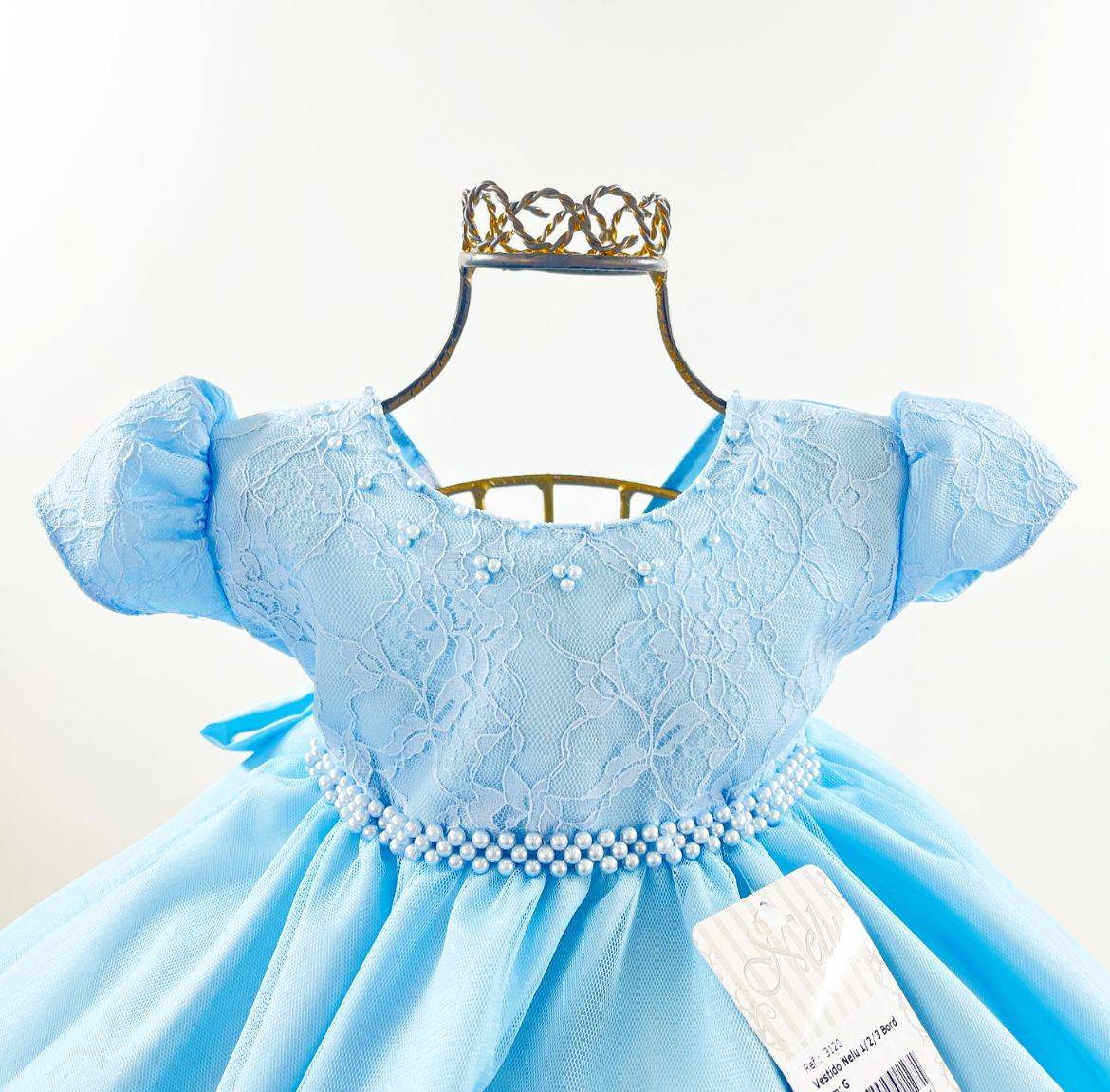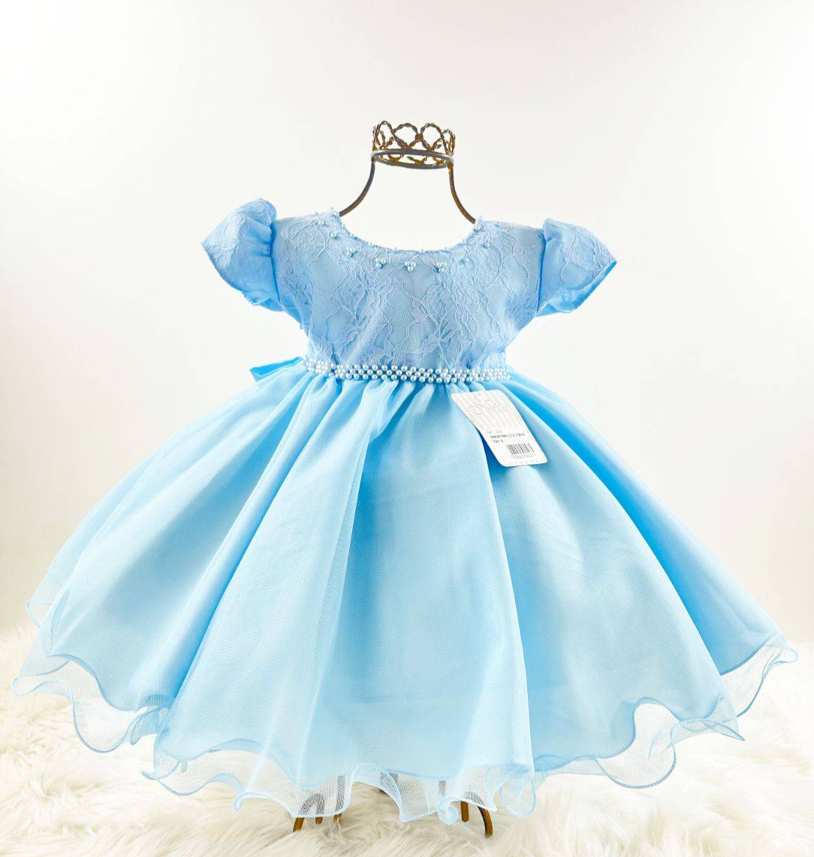 Vestido infantil manga curta, peito com renda com detalhes de pérolas sintéticas. Cintura bordada com pérolas sintéticas, saia lisa com uma camada de tule, elástico nas costas ajustável ao corpo.