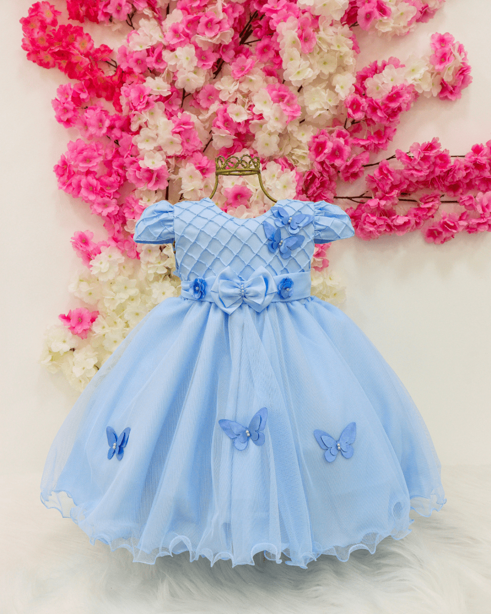Vestido infantil manga curta , peito quadriculado com aplicação de pérolas sintéticas e borboletas, cintura com cintinho. Saia com aplicação de borboletas. Elástico nas costas ajustável ao corpo e faixa para melhor ajuste.
