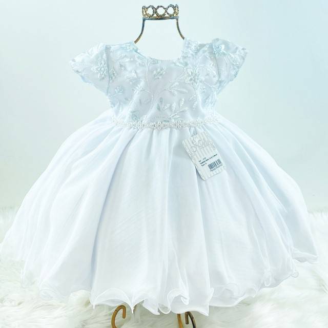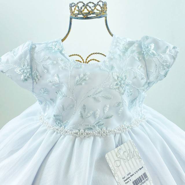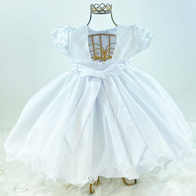Vestido infantil manga curta, peito com renda . Cintura bordada com pérolas sintéticas, saia lisa com uma camada de tule, elástico nas costas ajustável ao corpo.