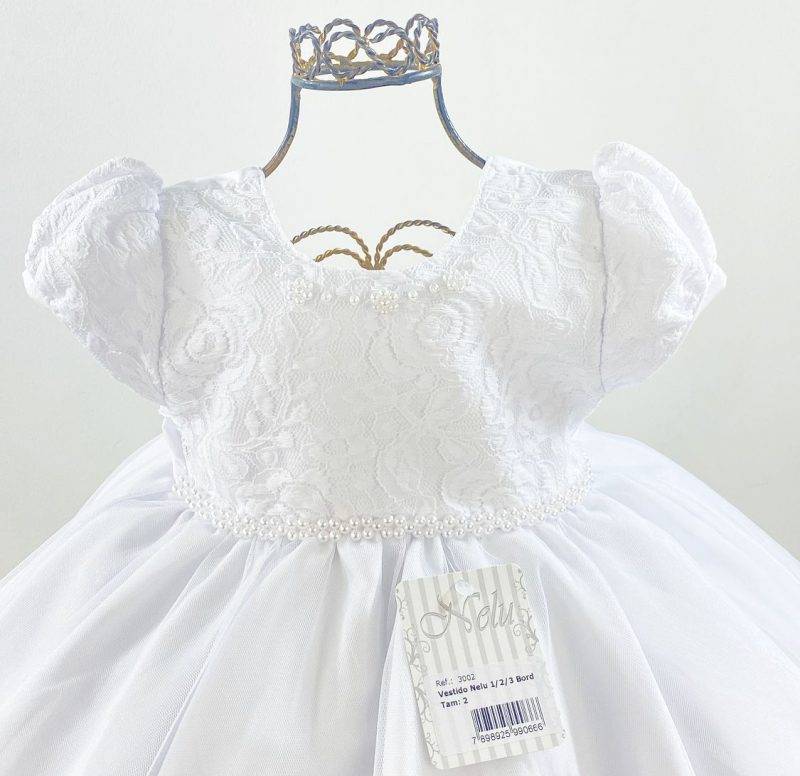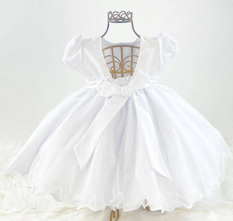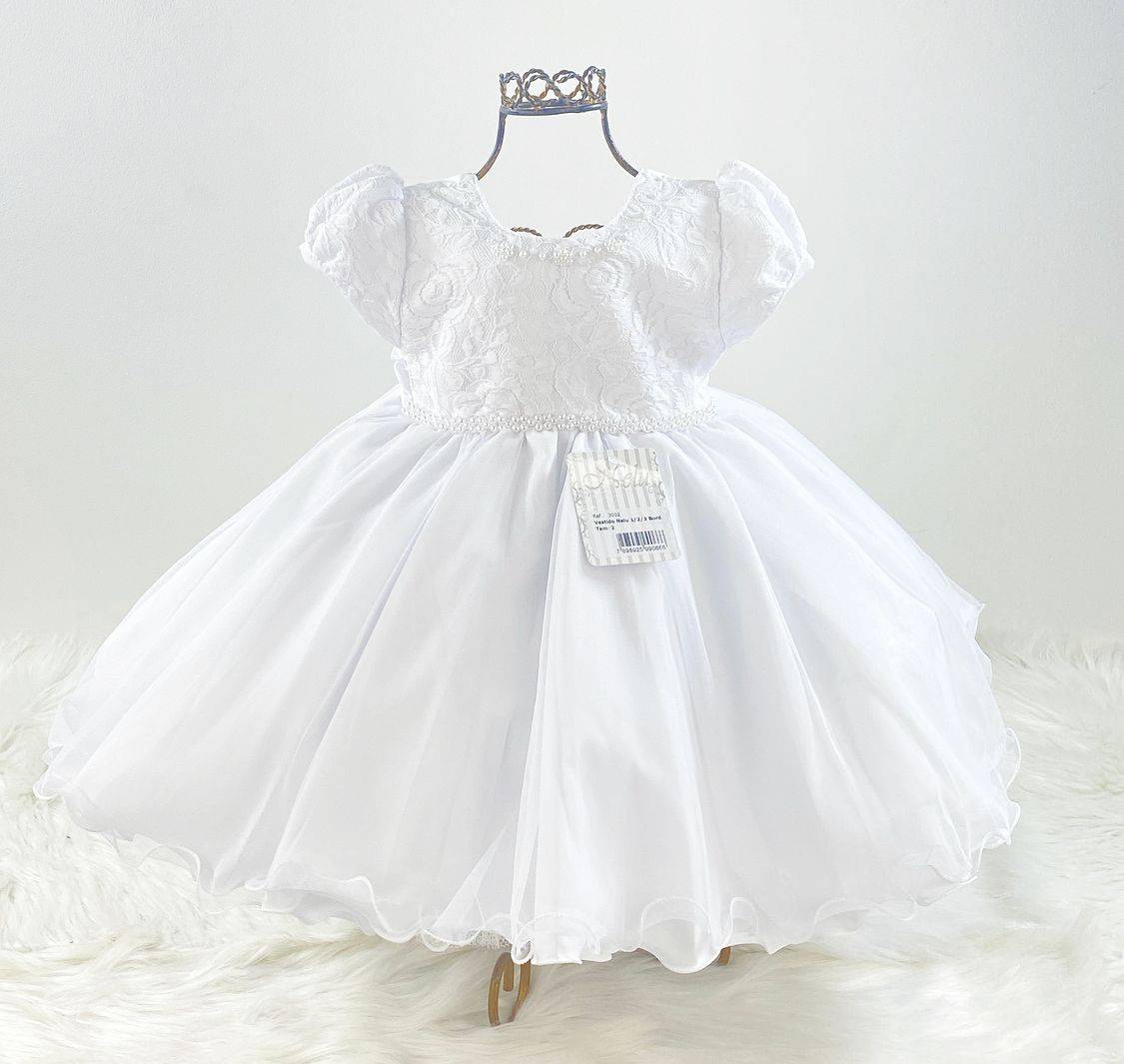 Vestido infantil manga curta, peito com renda, peito e cintura bordado com pérolas sintéticas branca, saia lisa com camada de tule. Contém fecho nas costas por botões.