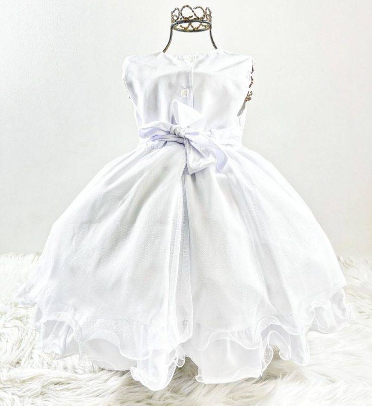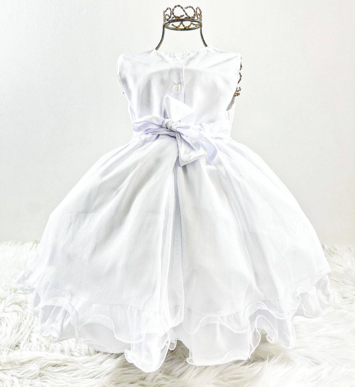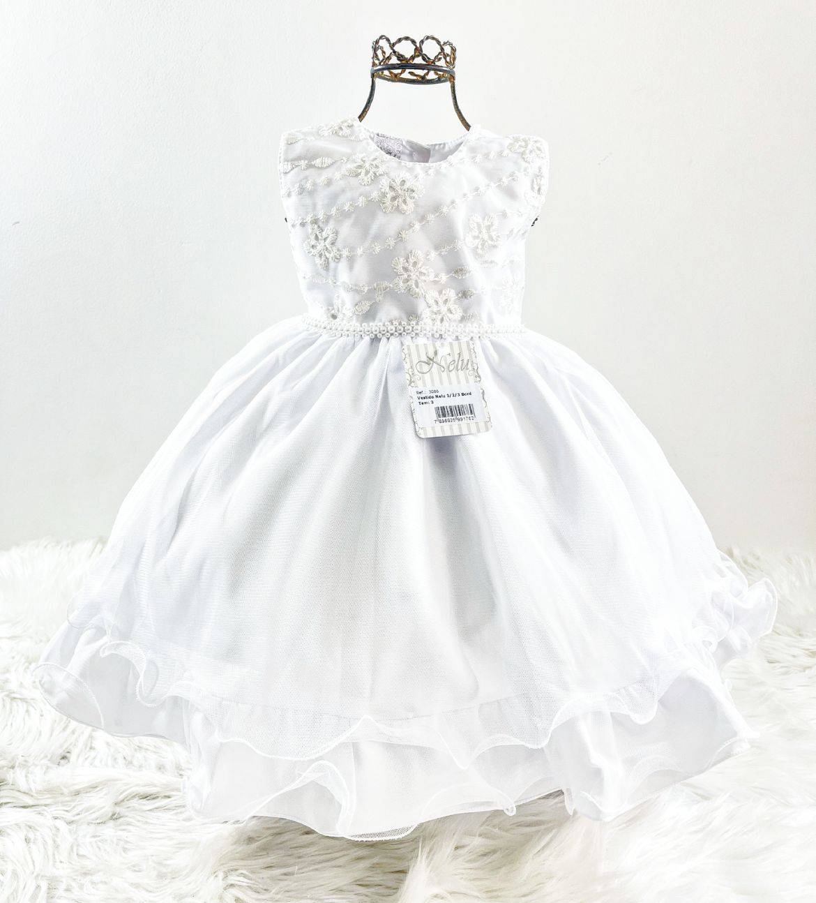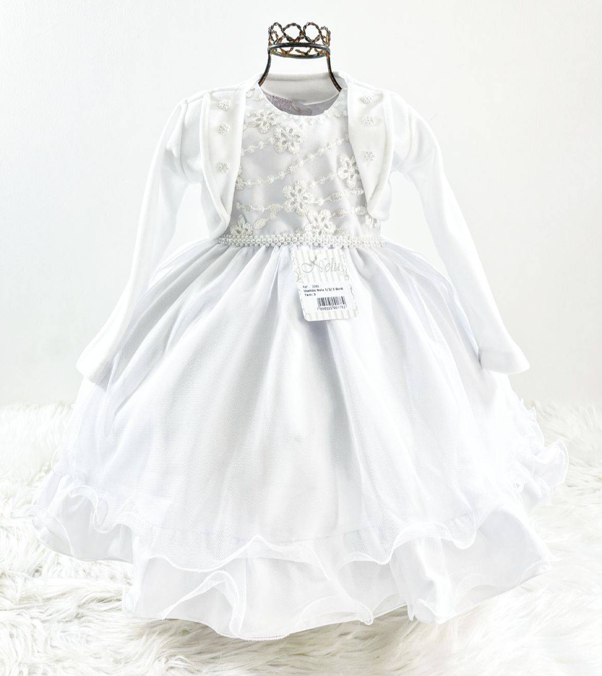 Vestido infantil regata com bolero, peito renda com pérolas sintéticas. Cintura com passante para cintinho de pérolas sintéticas, saia lisa com camada de tule,elástico nas costas ajustável ao corpo.