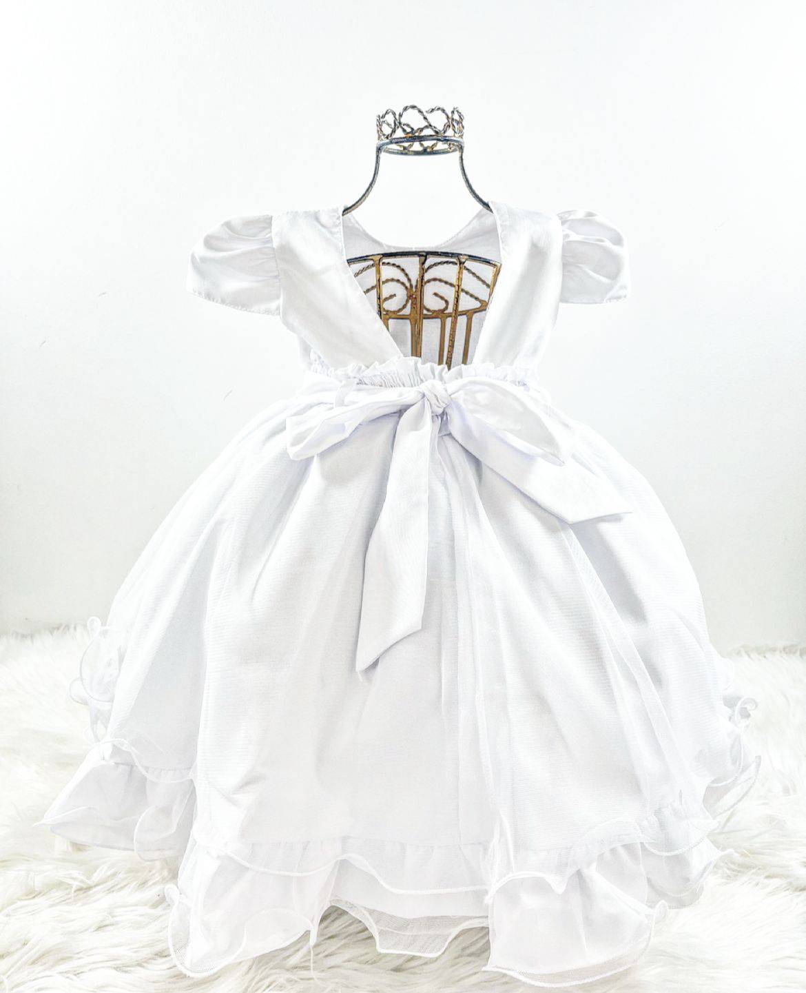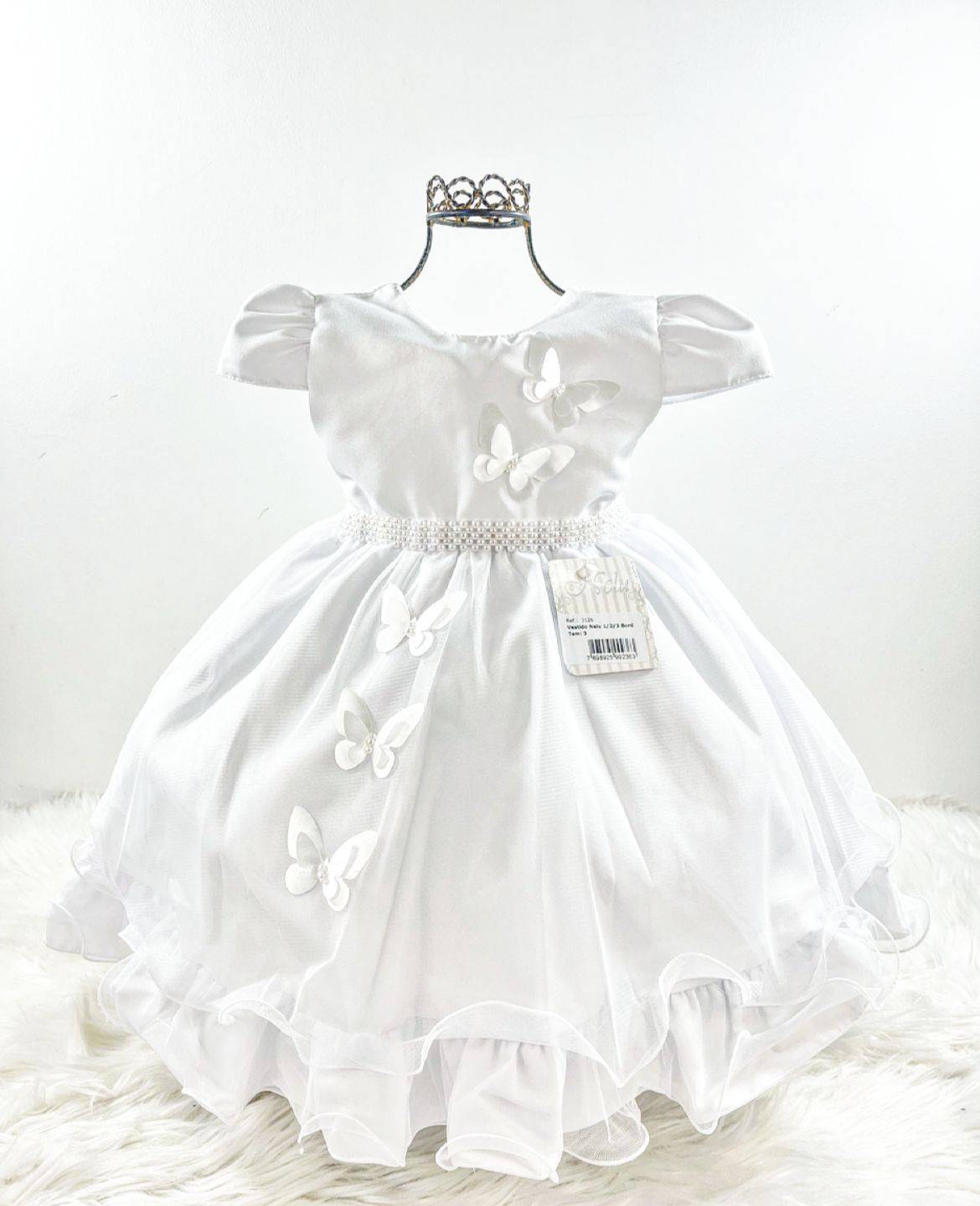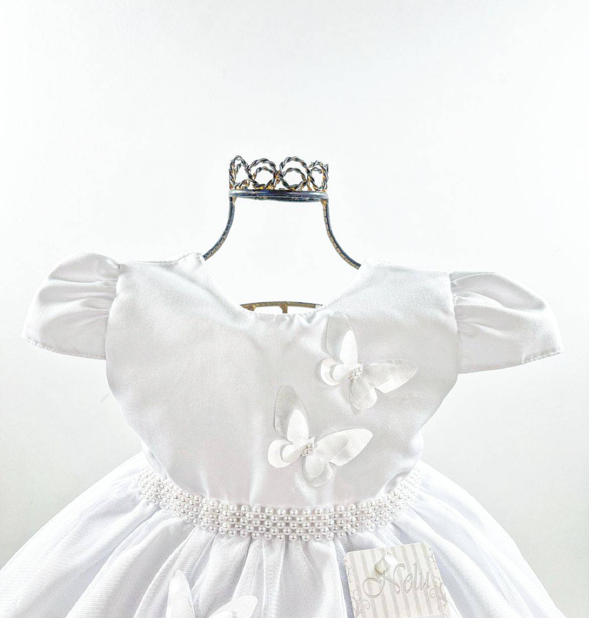 Vestido infantil manga curta , peito quadriculado com aplicação de pérolas sintéticas e borboletas, cintura com cintinho. Saia com aplicação de borboletas. Elástico nas costas ajustável ao corpo e faixa para melhor ajuste.