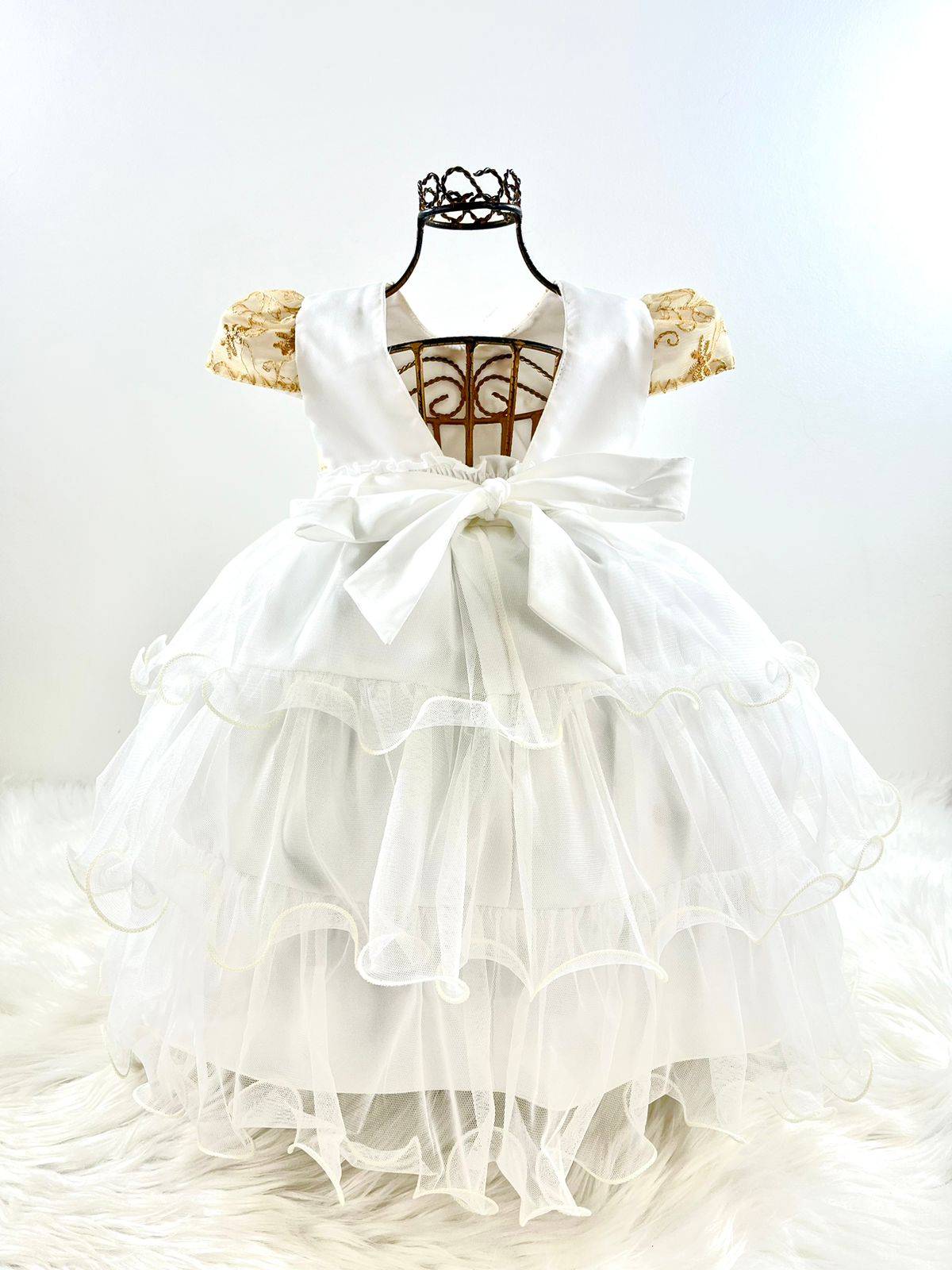 Vestido infantil manga curta, peito com renda e pérolas sintéticas. Cintura bordada com pérolas sintéticas, saia com babados, elástico nas costas ajustável ao corpo.