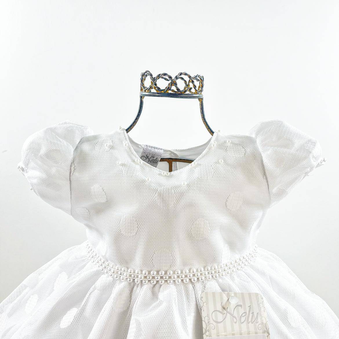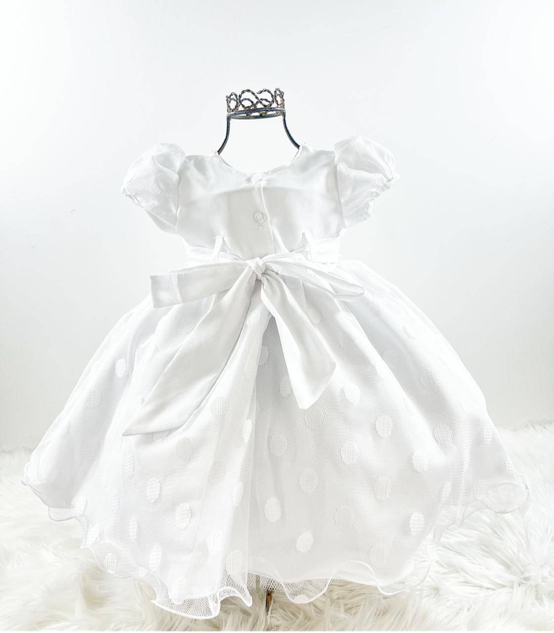 Vestido infantil manga curta , tule poa bordado.Cintura bordada com pérolas sintéticas, saia lisa com uma camada de tule,fecho nas costas por botões e faixa para ajuste ao corpo. Cor: Branco