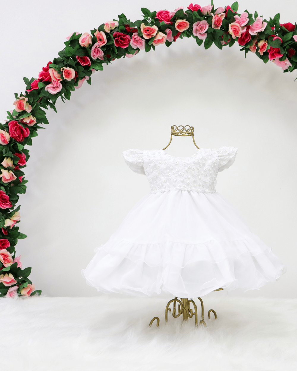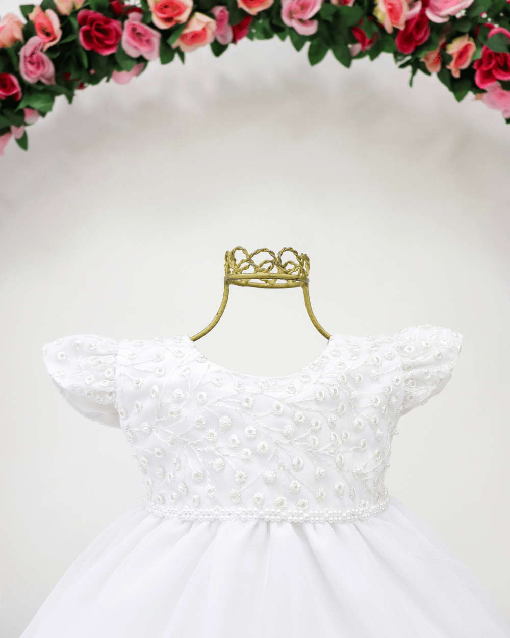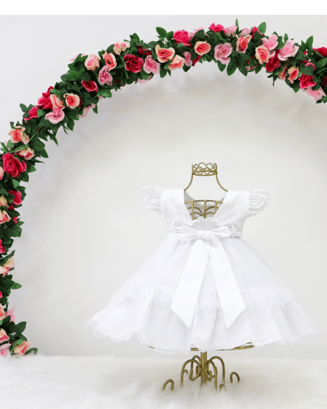 Vestido infantil manga curta, peito rendado com aplicações em pérolas sintéticas. Cintura bordada com pérolas sintéticas, saia lisa com babados no fim, elástico nas costas ajustável ao corpo.