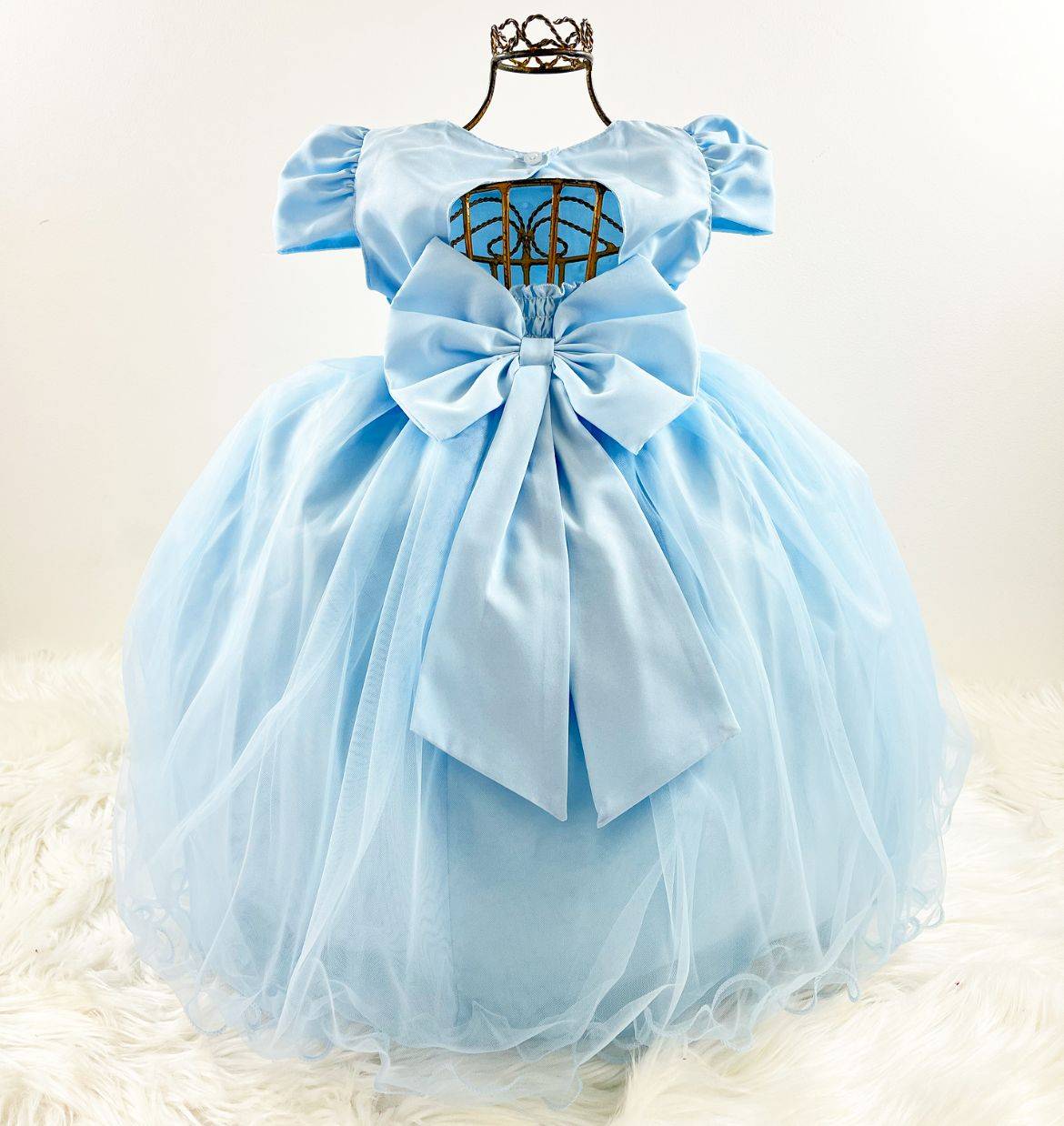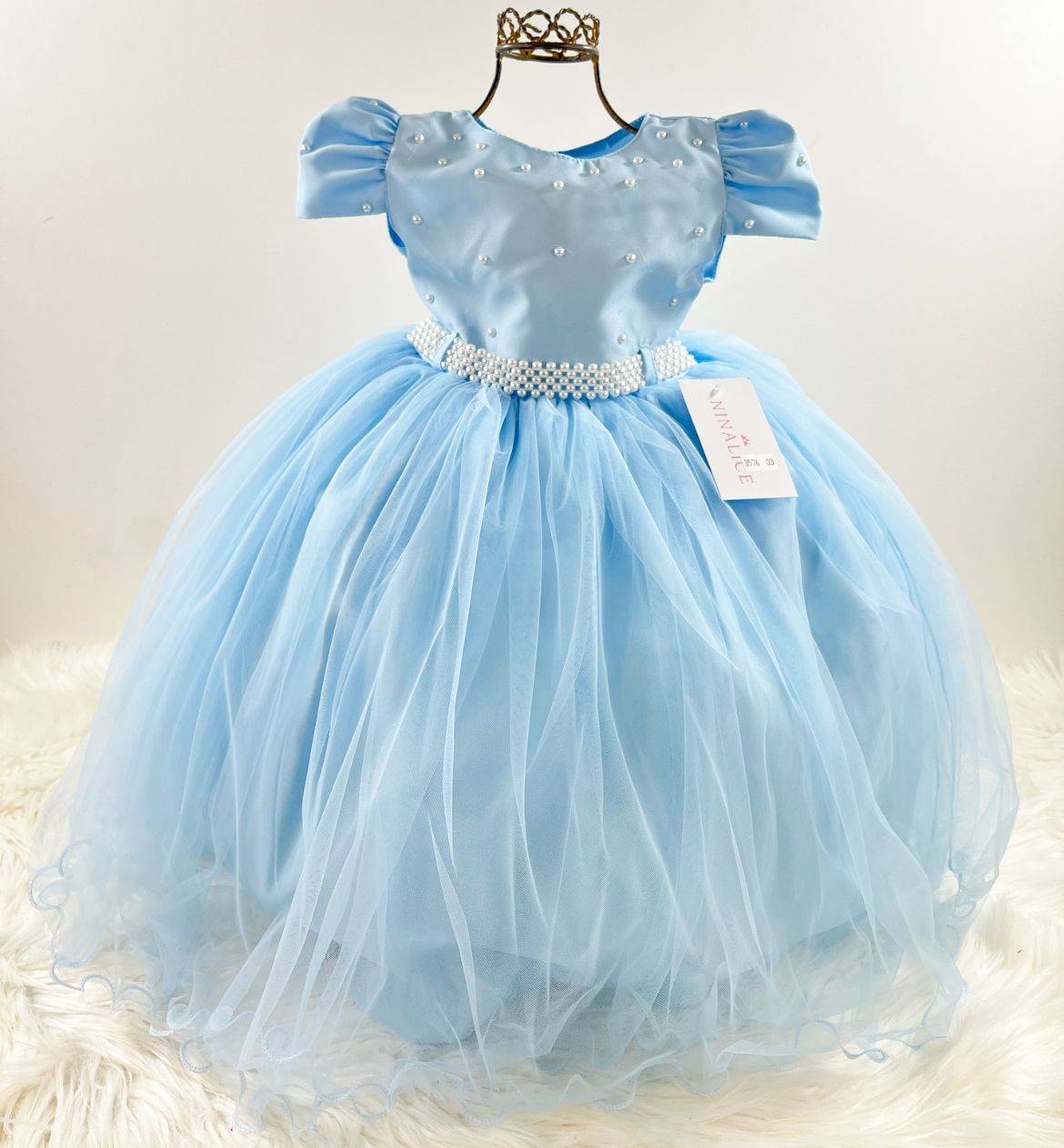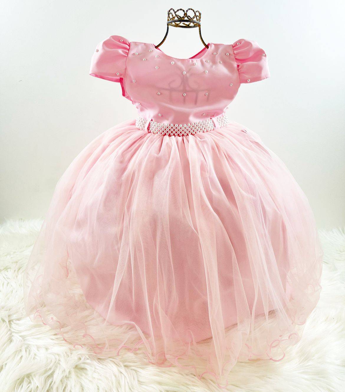 Vestido manga curta infantil, peito liso com aplicações de pérolas sintéticas. Cintura com cinto de pérolas sintéticas. Saia com camada de tule transparente. Elástico nas costas ajustável ao corpo.