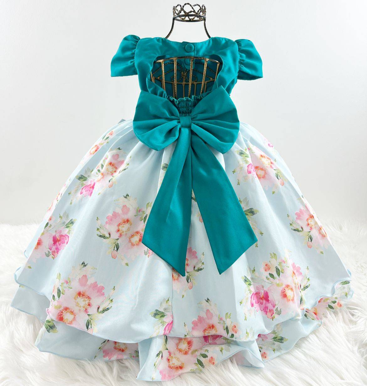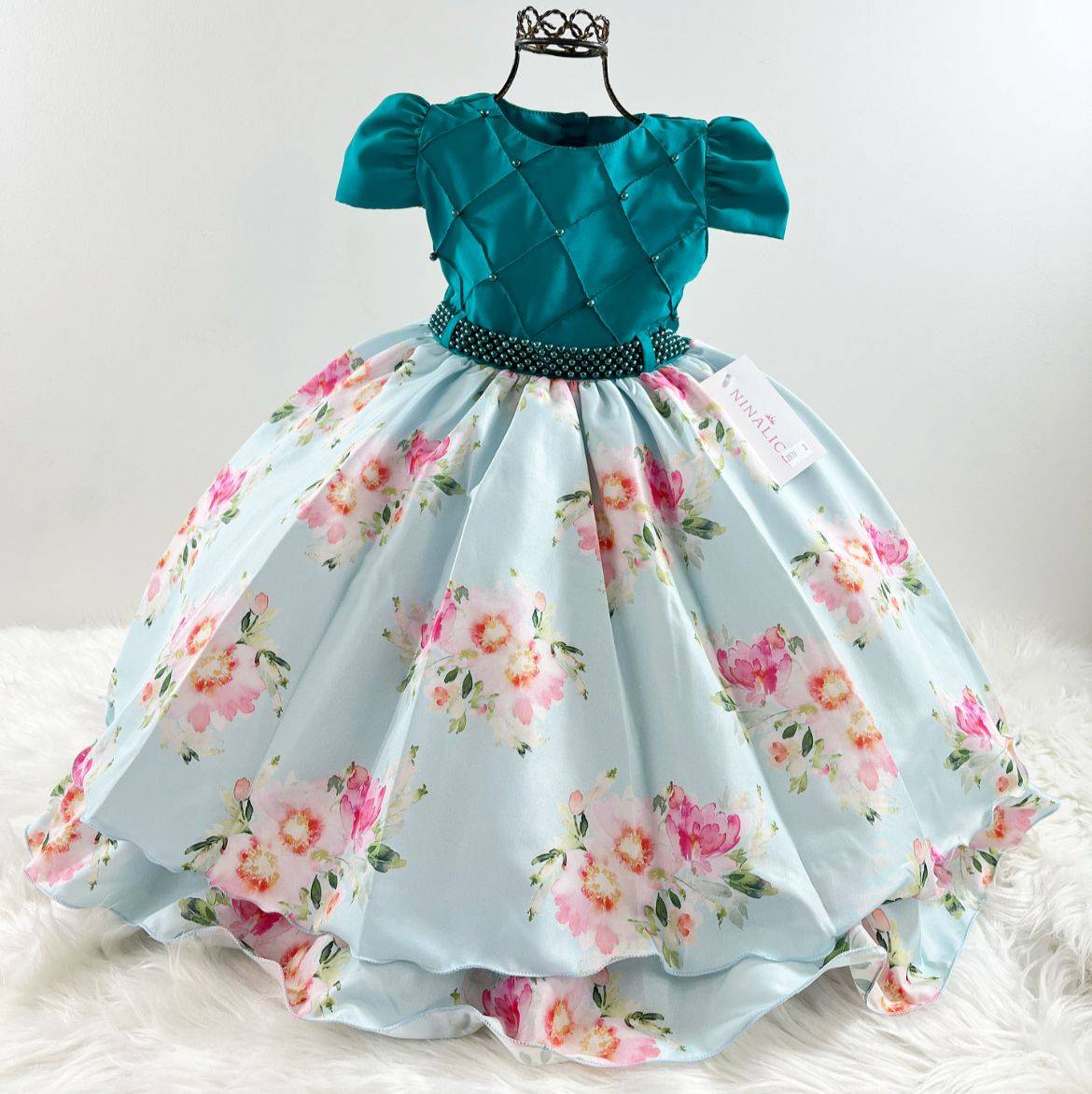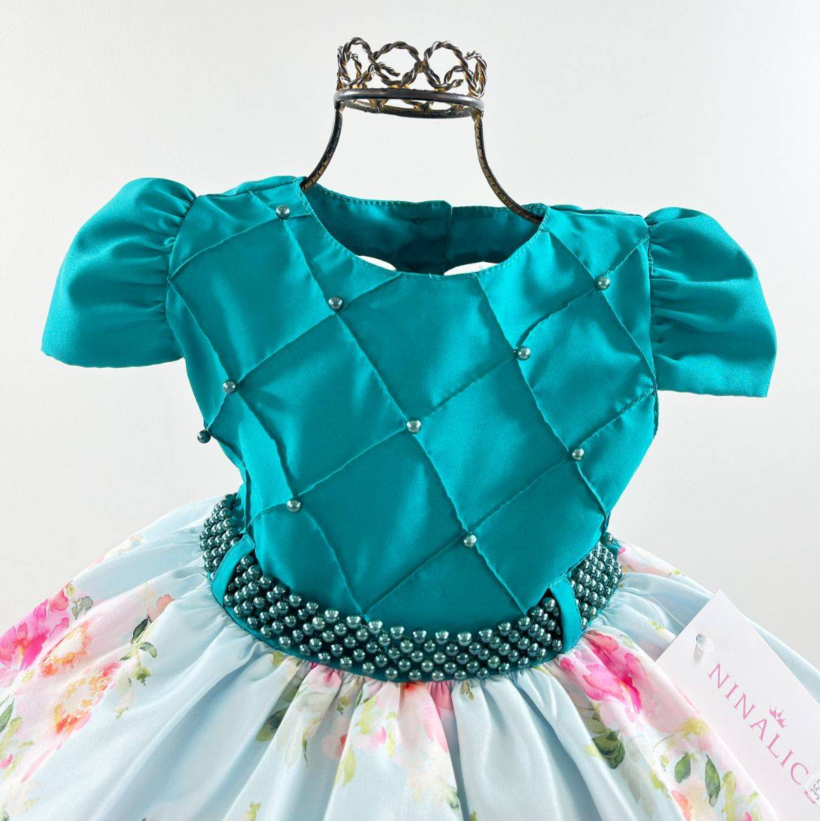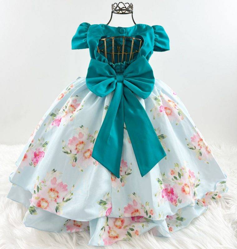 Vestido manga curta infantil, peito com nervura quadriculado e aplicações. Cintura com pérolas sintéticas. Saia com estampa floral. Elástico nas costas ajustável ao corpo.