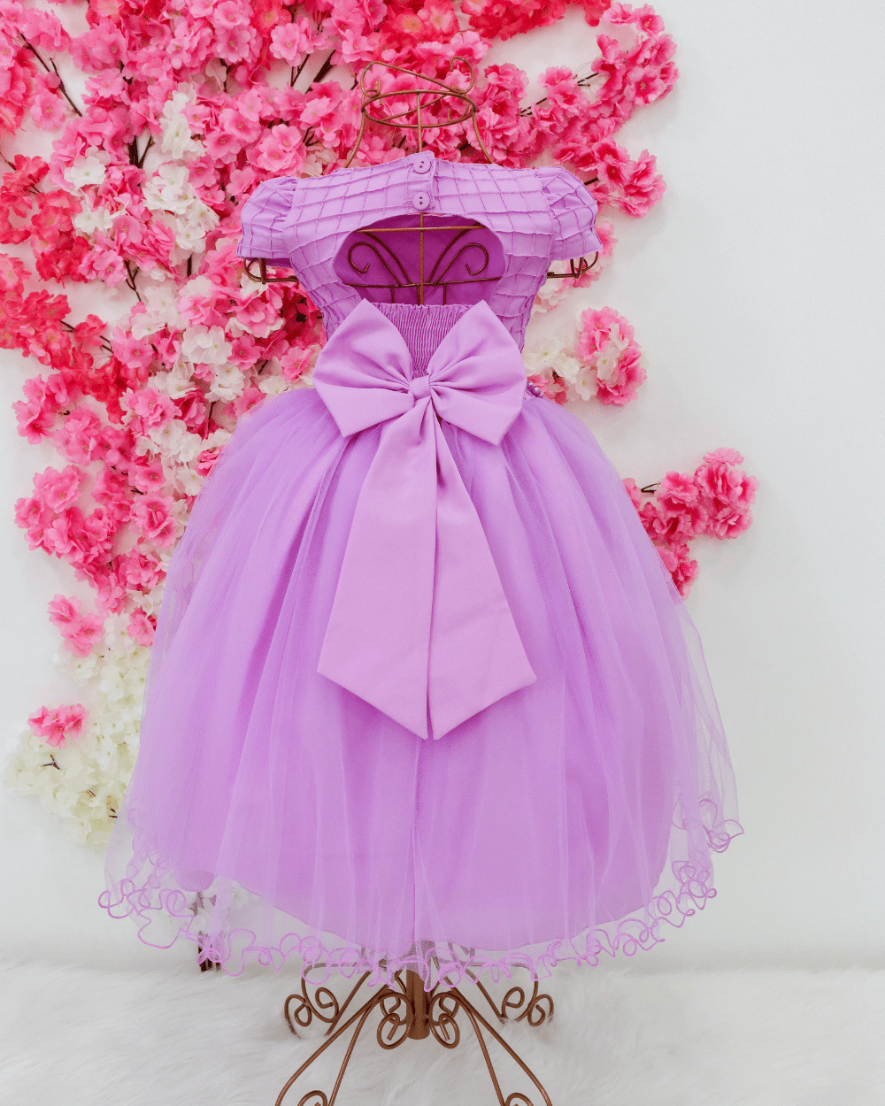 Vestido manga curta infantil, peito com nervura quadriculado e aplicações. Cintura com pérolas sintéticas. Saia com camada de tule transparente. Elástico nas costas ajustável ao corpo.
