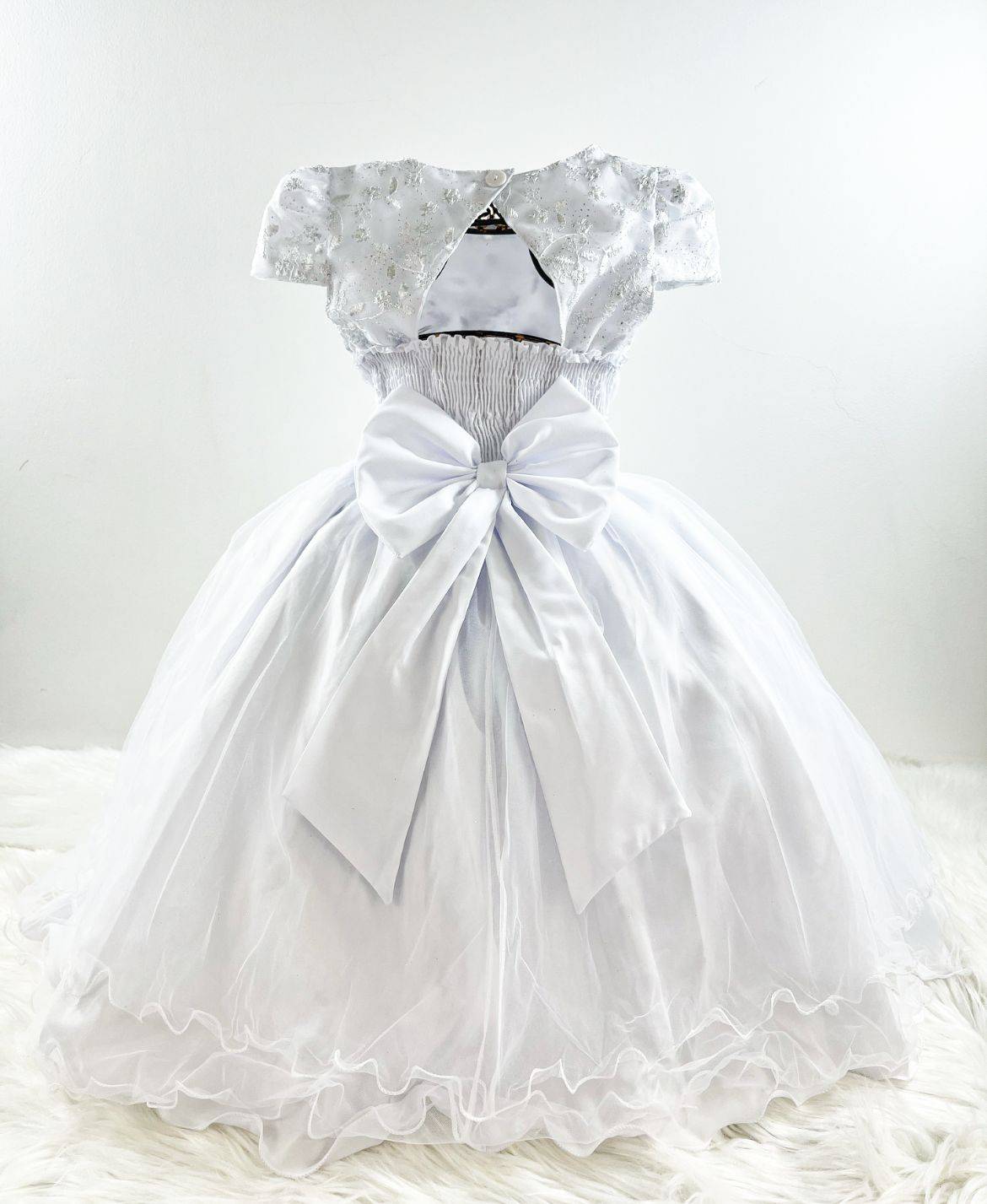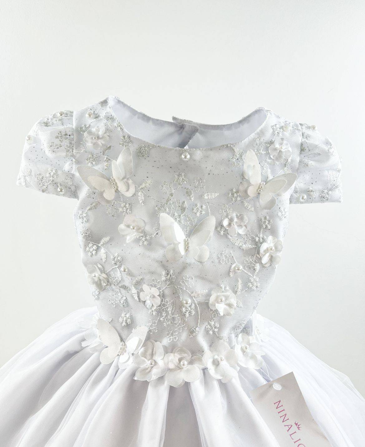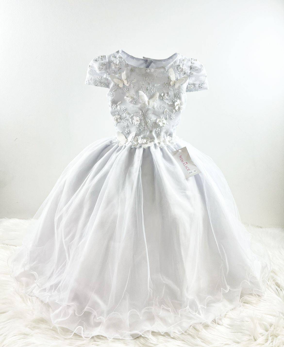 Vestido manga curta infantil, peito bordado com aplique de borboletas. Saia com camada de tule transparente com aplicações de borboletas e flores . Elástico nas costas ajustável ao corpo.