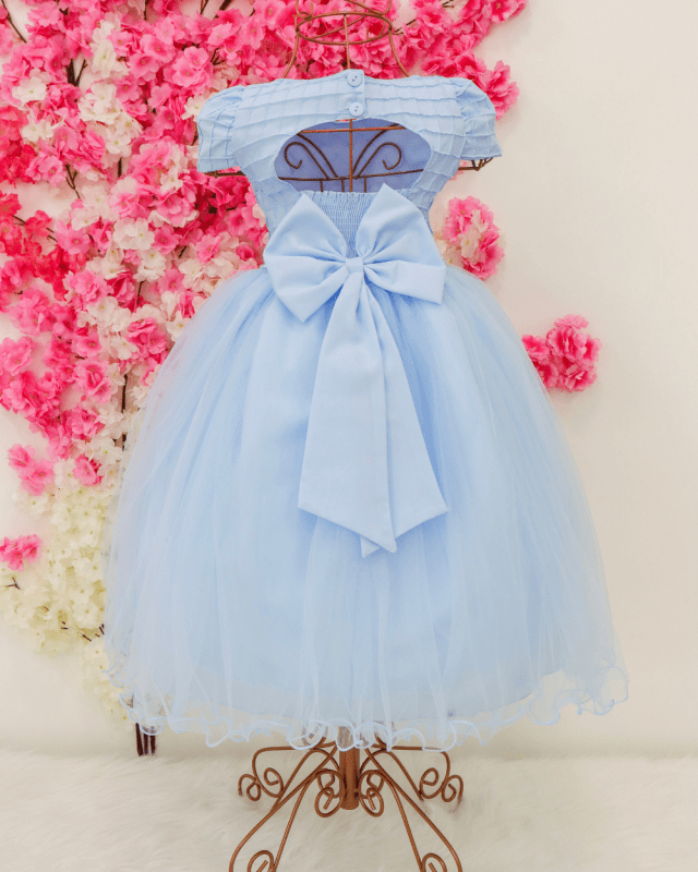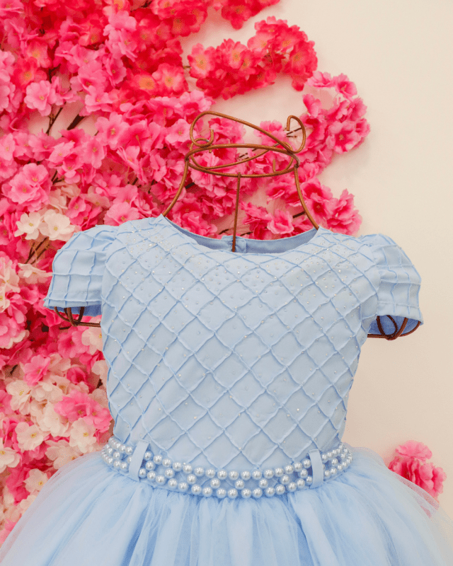Vestido manga curta infantil, peito com nervura quadriculado e aplicações. Cintura com pérolas sintéticas. Saia com camada de tule transparente. Elástico nas costas ajustável ao corpo.