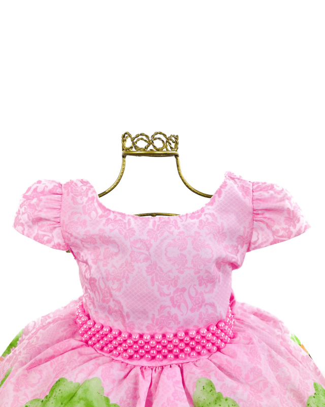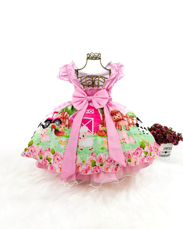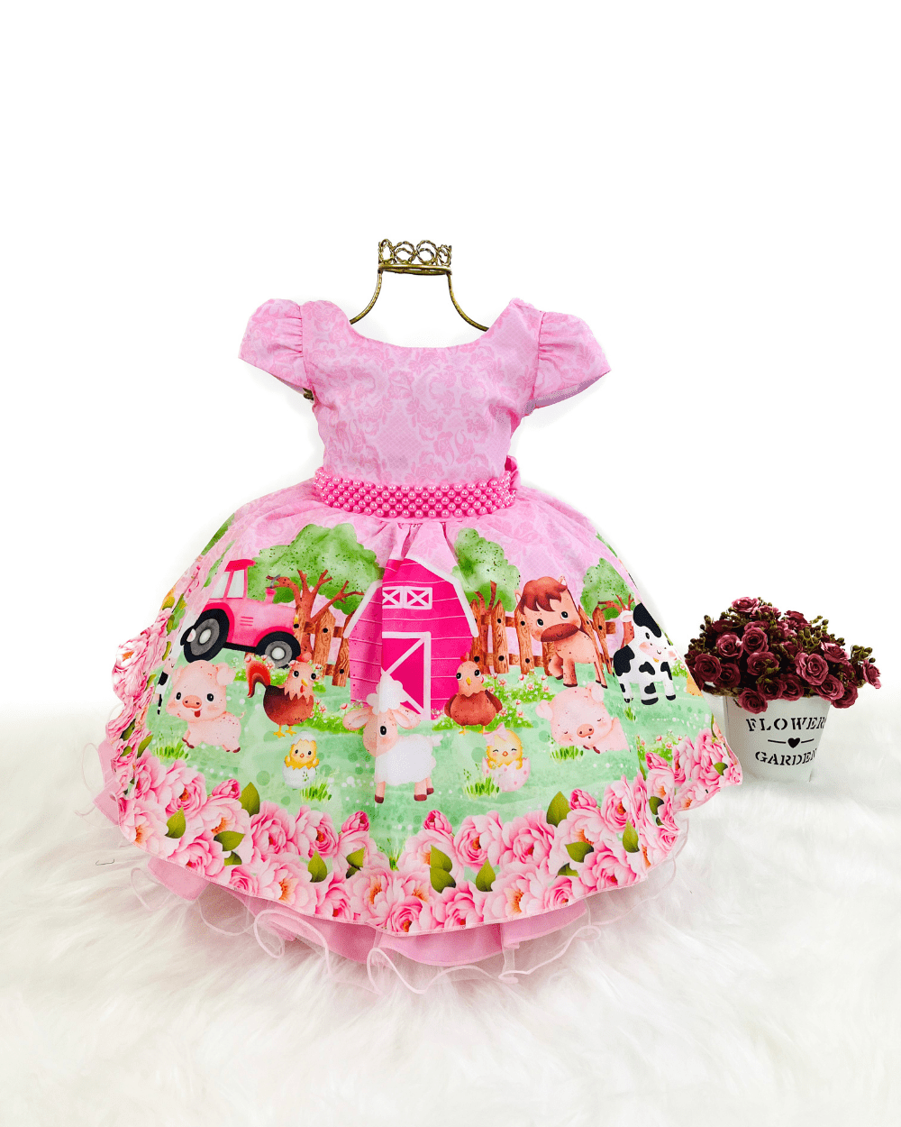 Vestido Piu Bella modelo tematico FAZENDINHA ROSA, lindo para festa de aniversário tem elástico nas costas para melhor ajuste ao corpo e um lindo cinto de pérolas que pode ser removido.