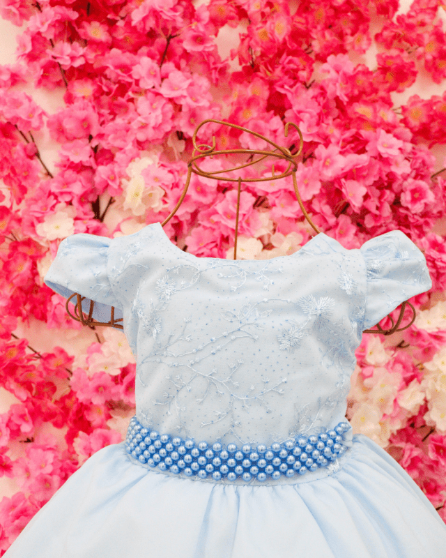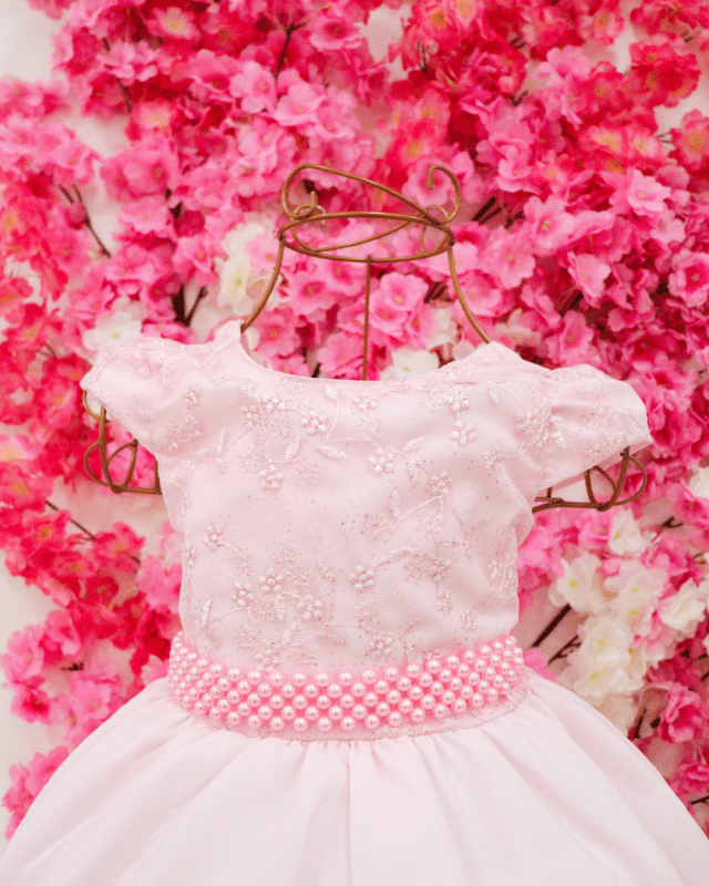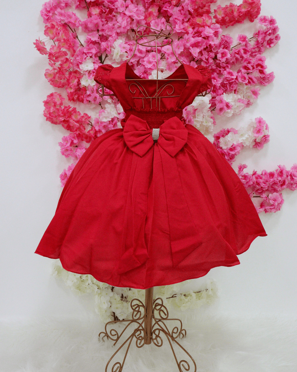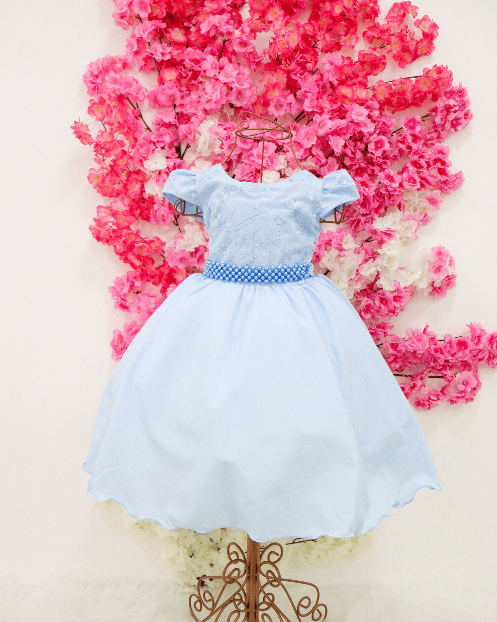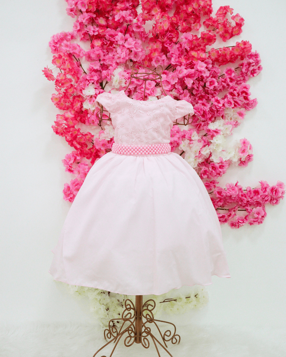Vestido infantil manga curta, peito com com renda ,saia lisa acabamento simples . Cintura com bordado de pérolas sintéticas. Nas costas contém elástico ajustável ao corpo , faixa e laço.
