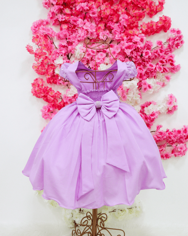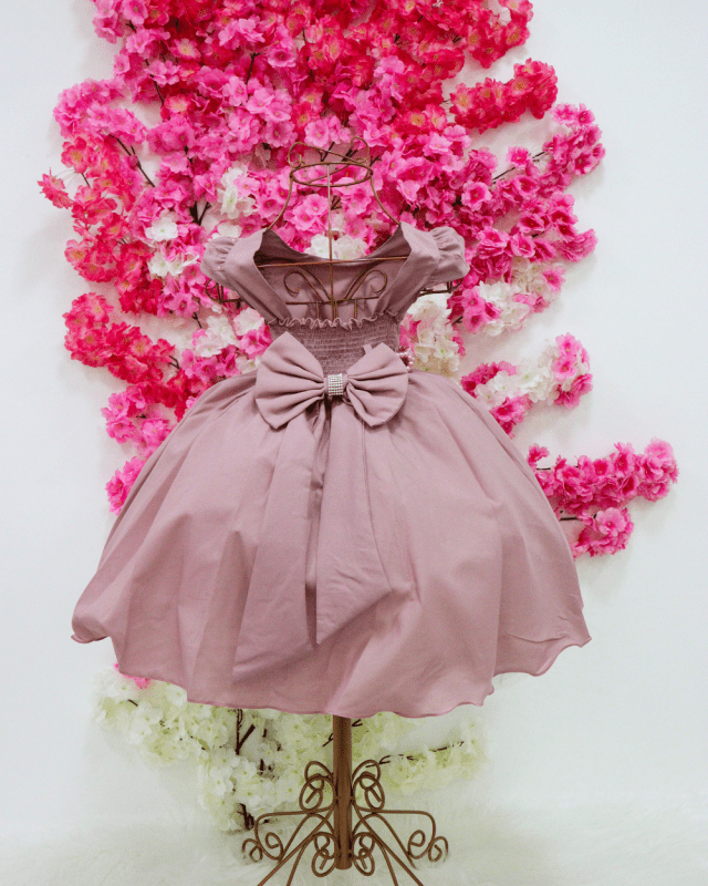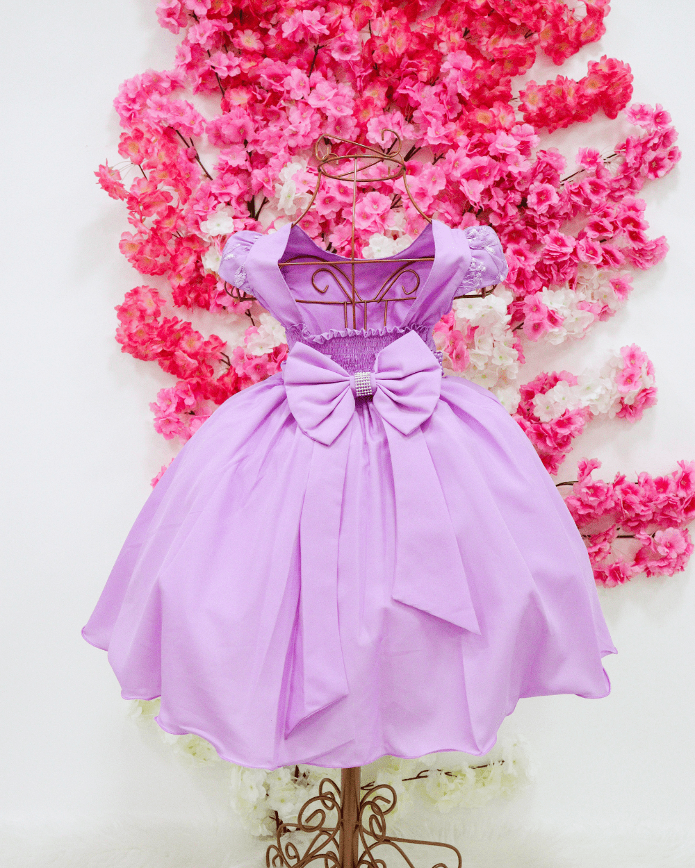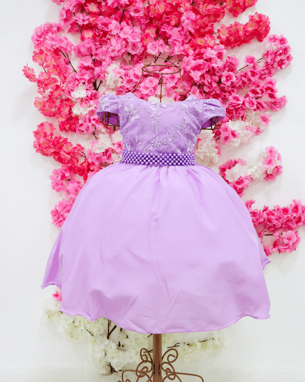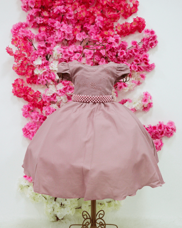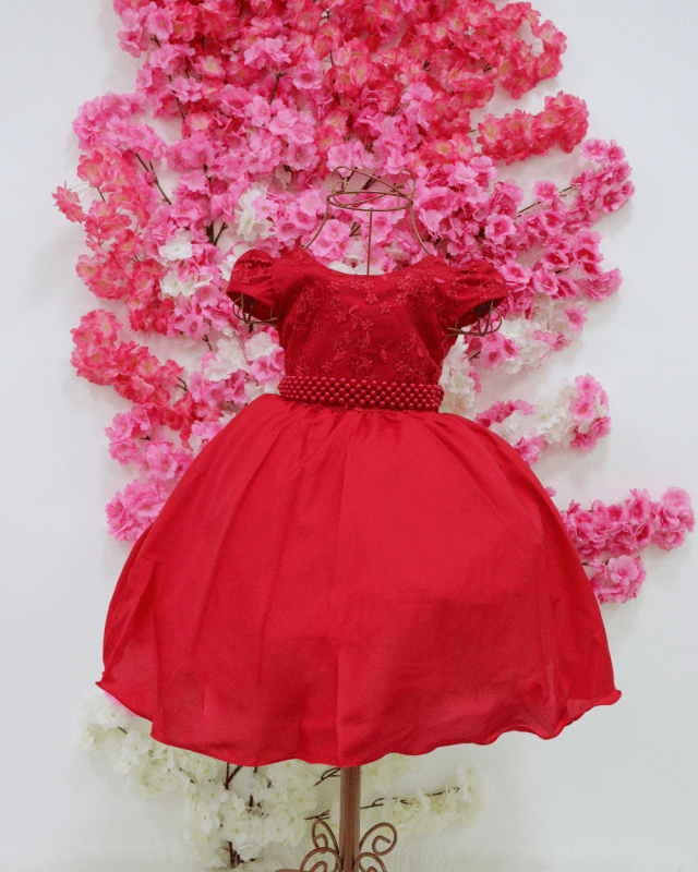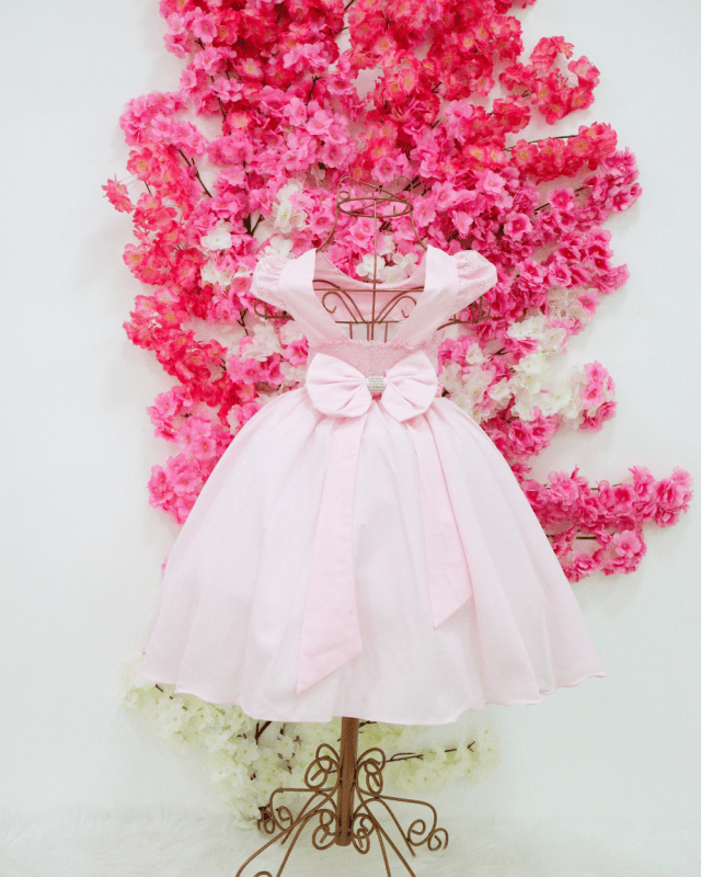 Vestido infantil manga curta, peito com com renda ,saia lisa acabamento simples . Cintura com bordado de pérolas sintéticas. Nas costas contém elástico ajustável ao corpo , faixa e laço.