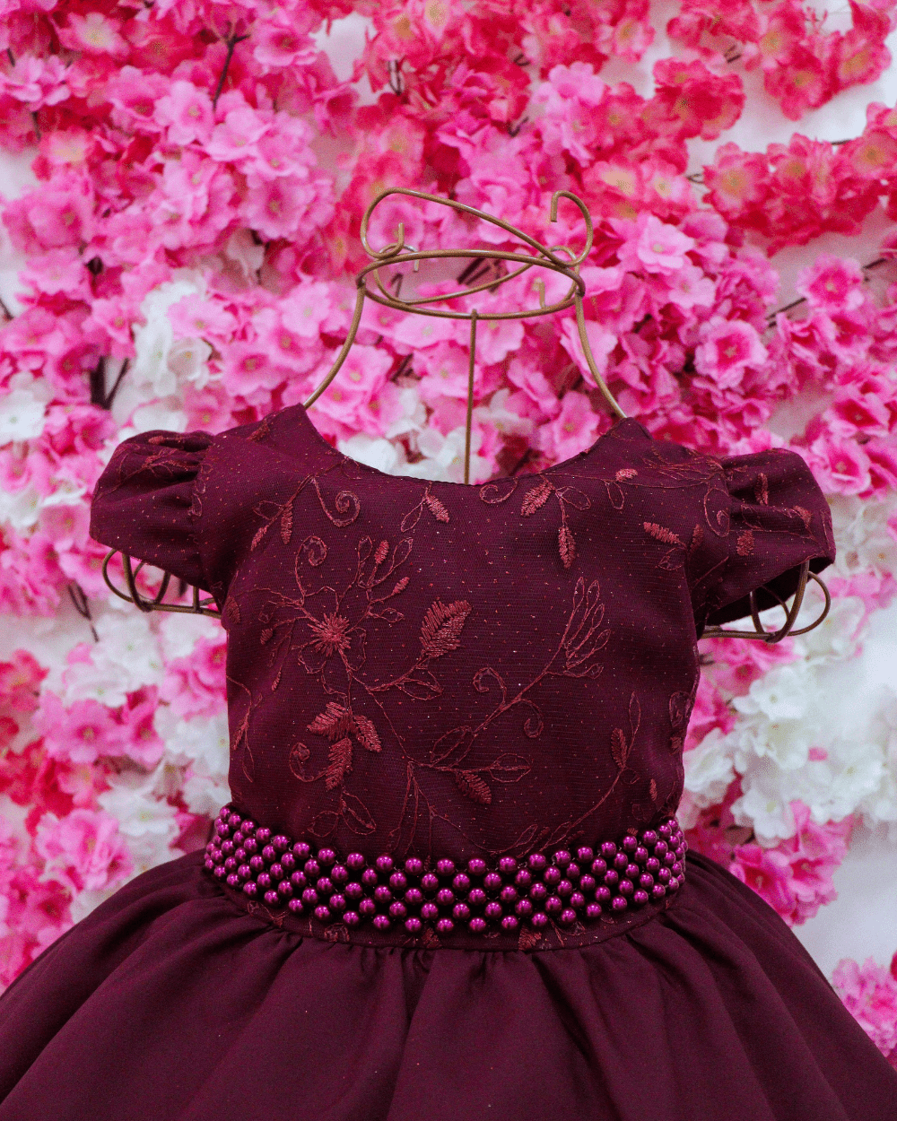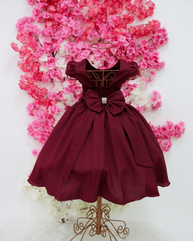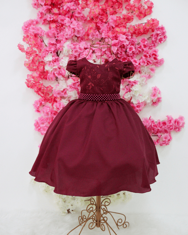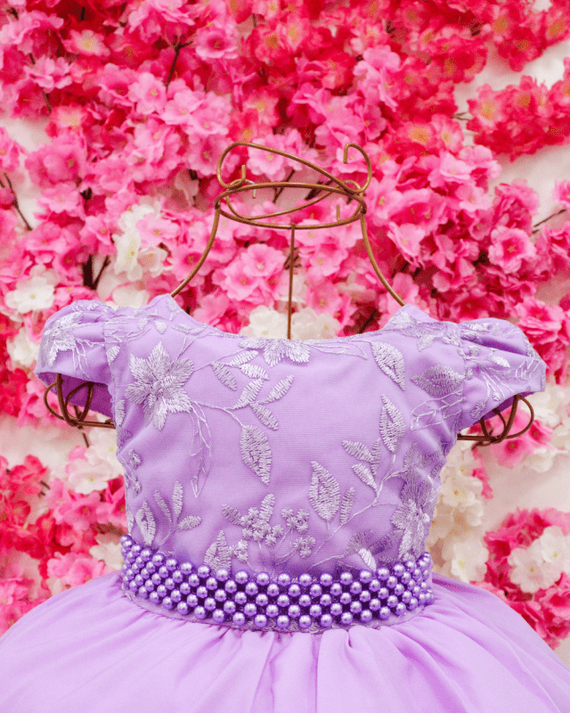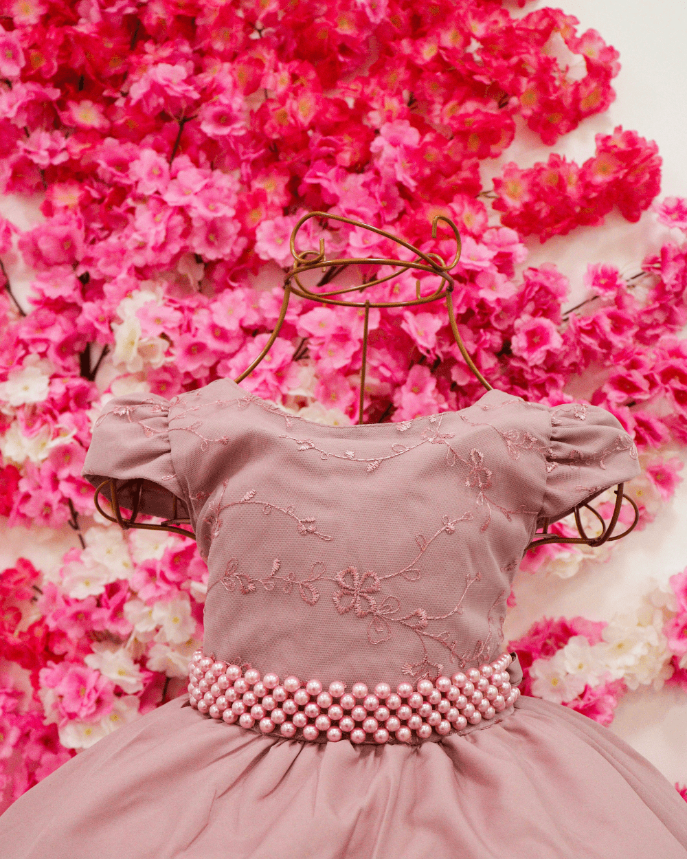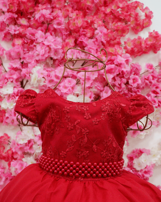 Vestido infantil manga curta, peito com com renda ,saia lisa acabamento simples . Cintura com bordado de pérolas sintéticas. Nas costas contém elástico ajustável ao corpo , faixa e laço.