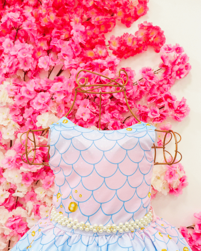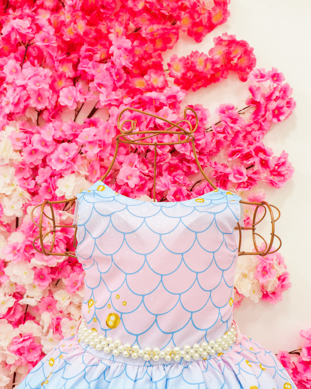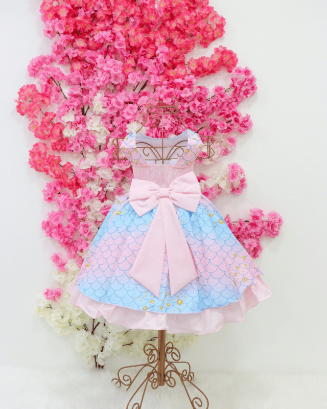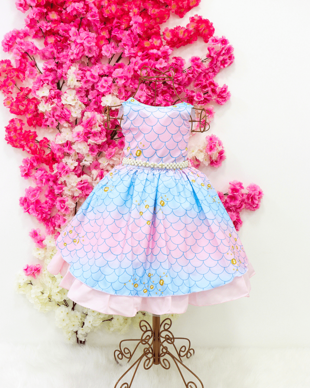 VESTIDO REGATA ESTAMPA TEMÁTICA: SEREIA .COM PÉROLAS SINTÉTICAS.LAÇO TRASEIRO- ELÁSTICO NAS COSTAS AJUSTÁVEL AO CORPO.
