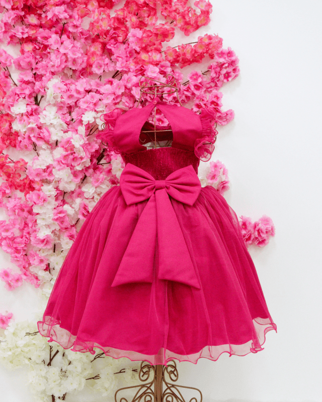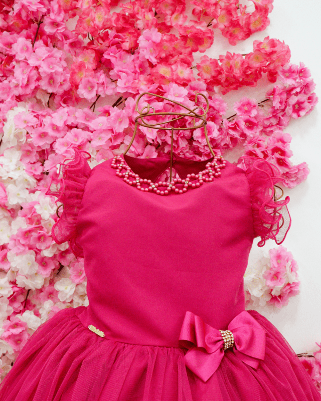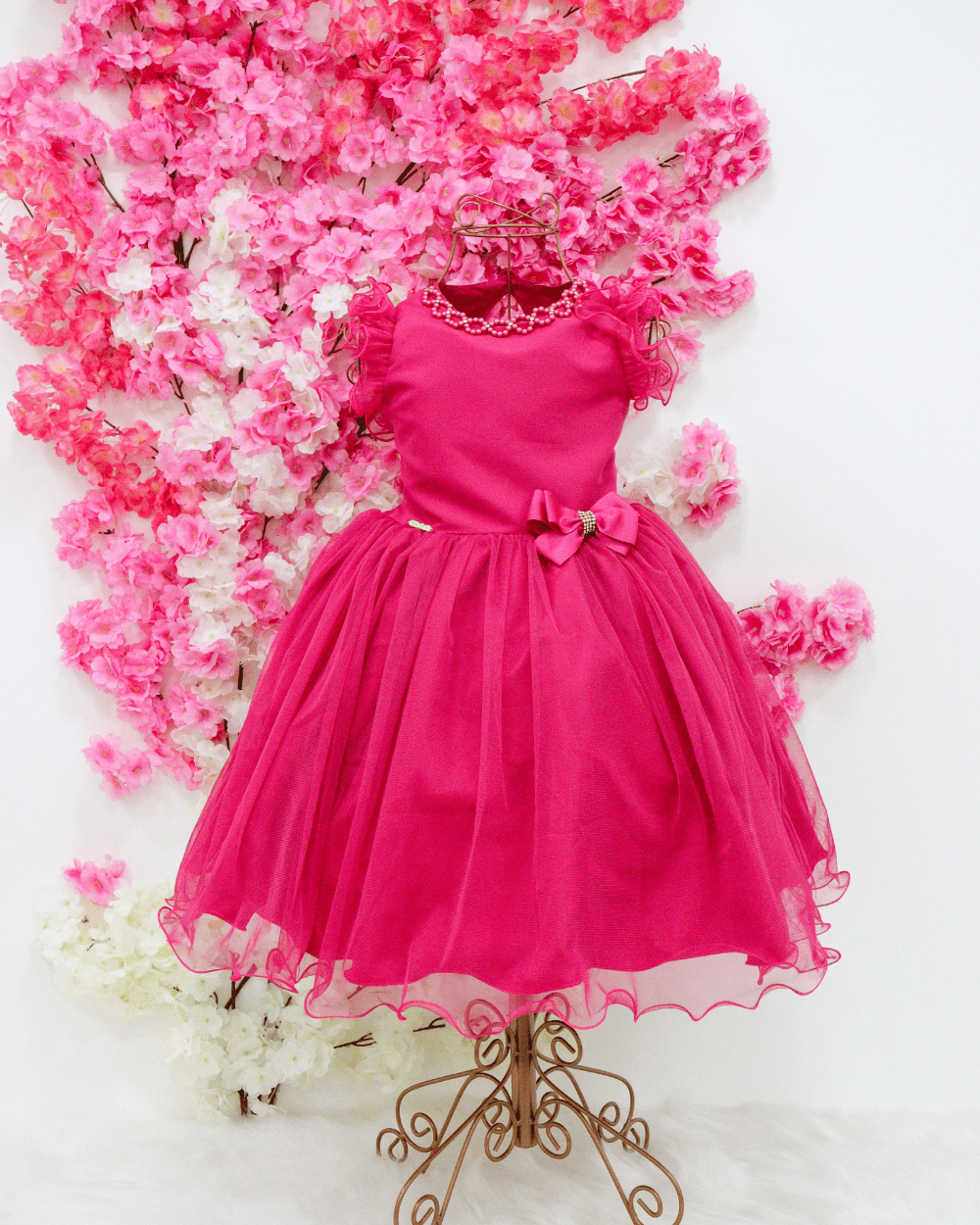 Vestido infantil manga curta, gola com pérolas sintéticas, manga em tule. Cintura com detalhe de uma laço, saia lisa de tule com acabamento de babado, elástico nas costas ajustável ao corpo e laço.