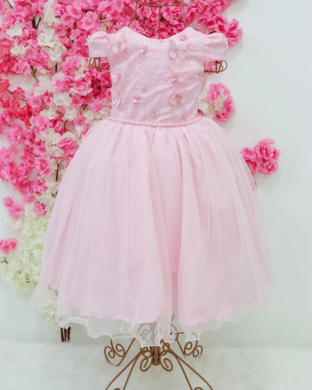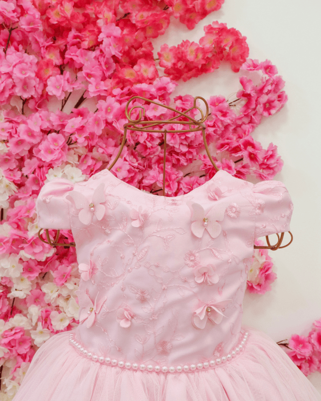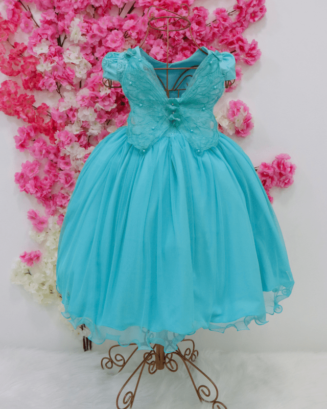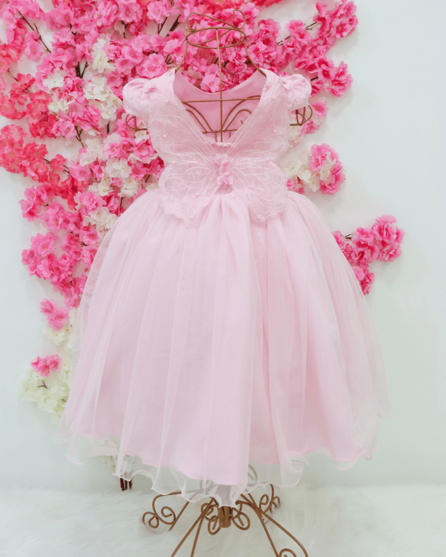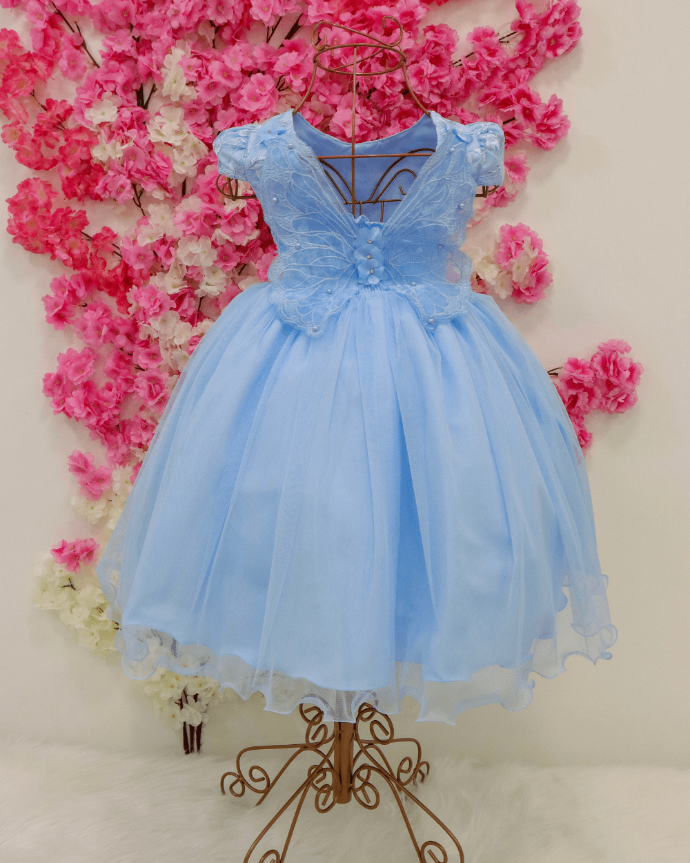 Vestido infantil manga curta com tule , peito rendado com aplicações de flores e borboletas. Cintura com pérolas sintéticas, saia lisa com tule de brilho, contém elástico atrás para melhor ajuste ao corpo e um lindo detalhe de asas de borboleta.