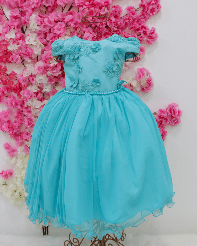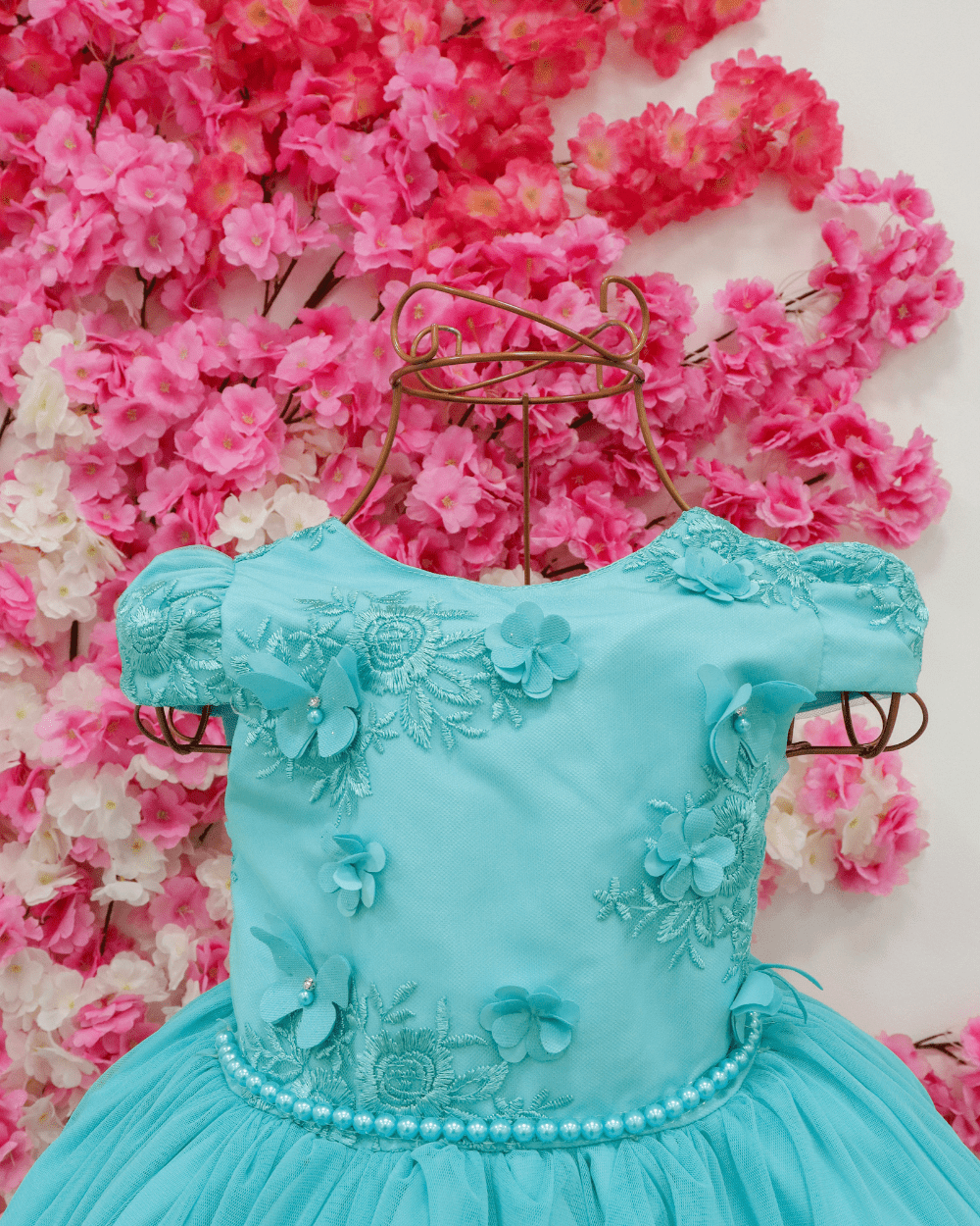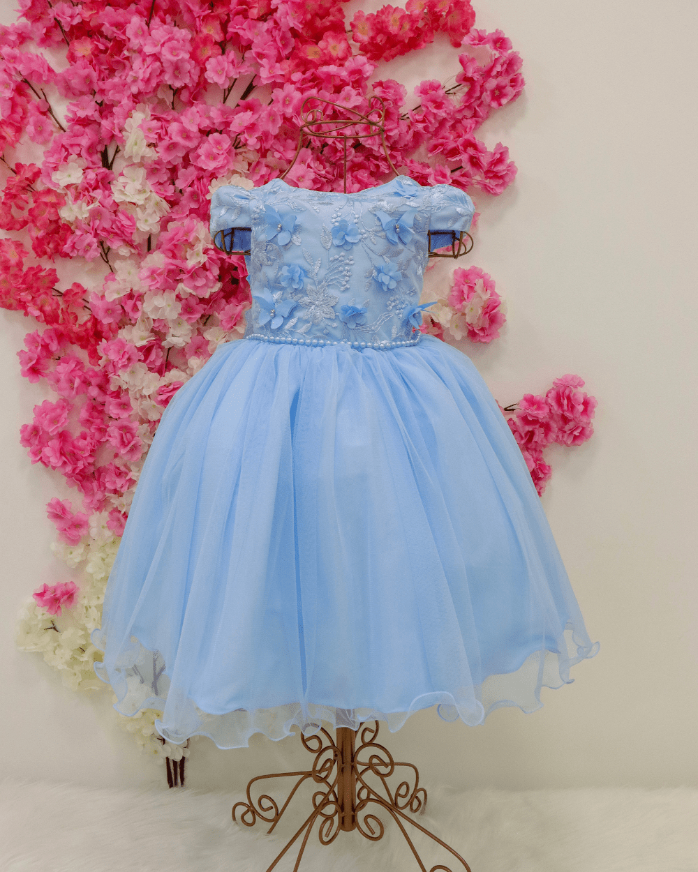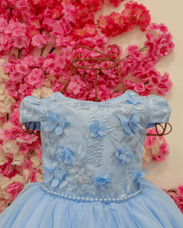 Vestido infantil manga curta com tule , peito rendado com aplicações de flores e borboletas. Cintura com pérolas sintéticas, saia lisa com tule de brilho, contém elástico atrás para melhor ajuste ao corpo e um lindo detalhe de asas de borboleta.