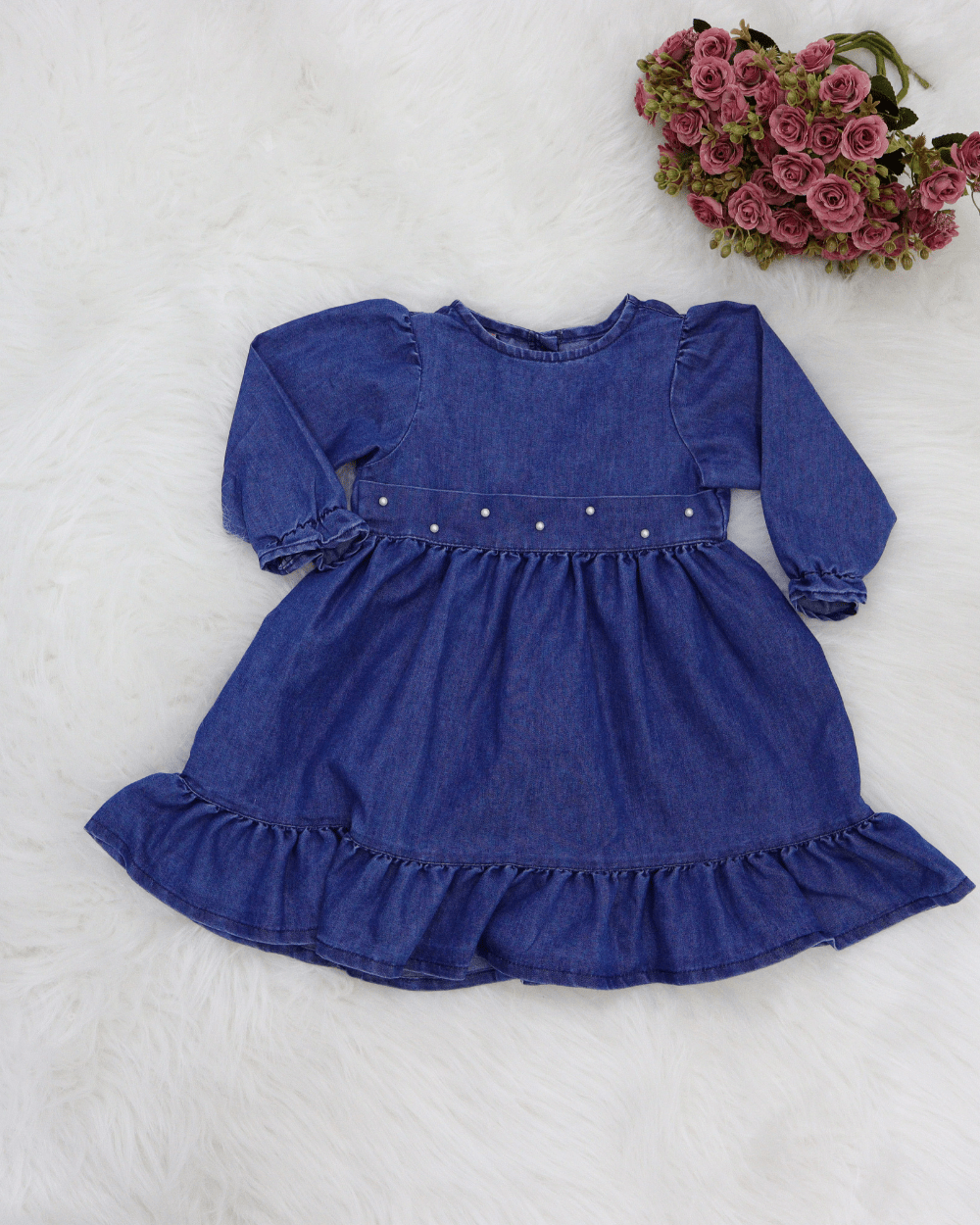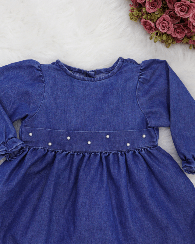 Vestido manga longa infantil jeans, cinrtura com aplicações de perolas e Fecho de botões nas costas.