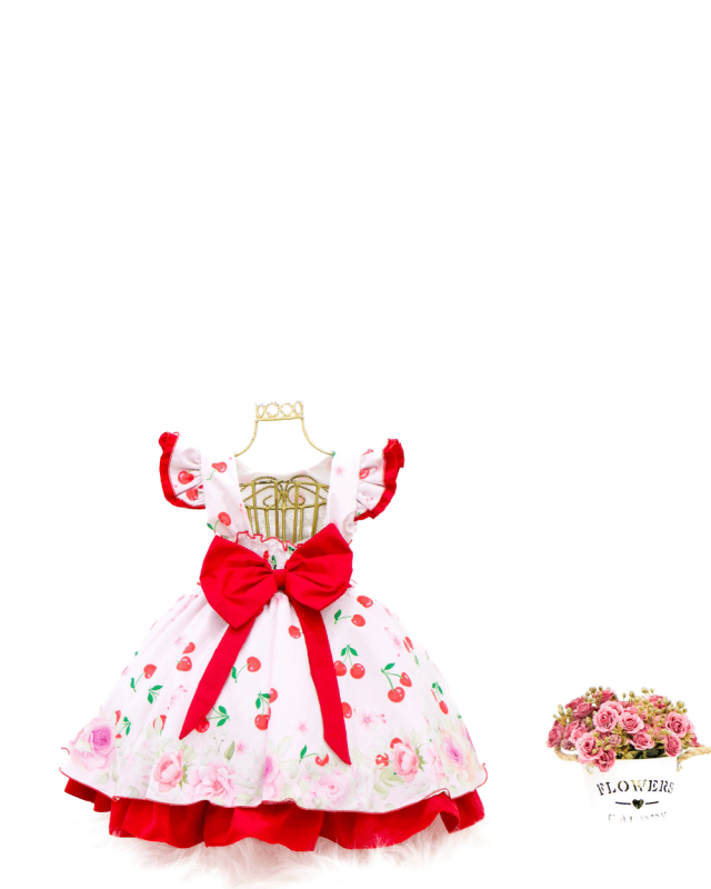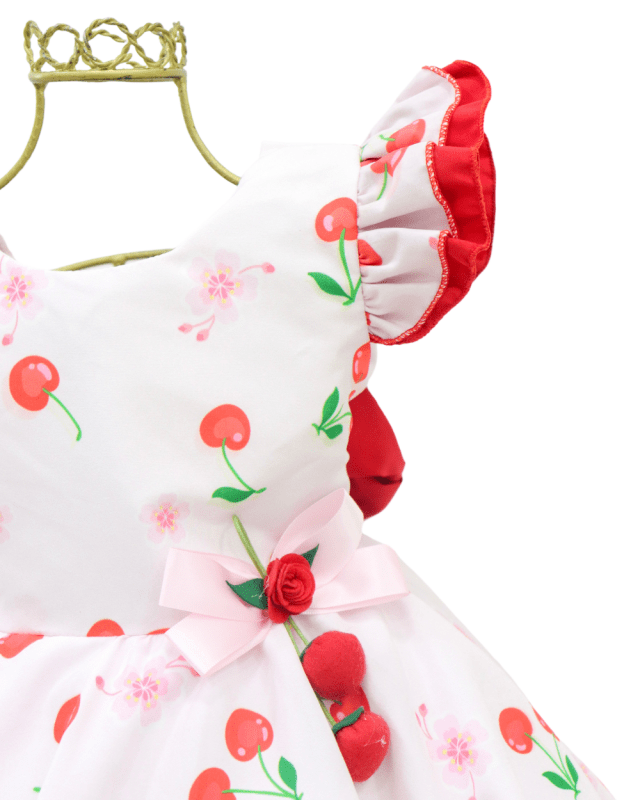 Vestido tema cerejinha lig lig, manguinha flu flu modelinho todo estampado com elástico nas costas para melhor se ajustar ao corpinho da criança e laço nas costas para deixar ele ainda mais encantador!