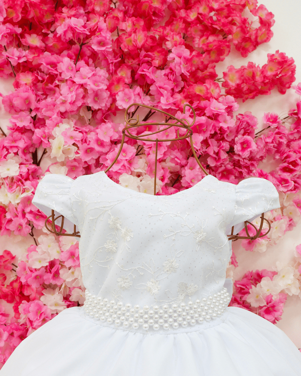 VESTIDO MANGA CURTA COM RENDA NO PEITO, CINTO EM PÉROLAS SINTÉTICAS, SAIA LISA LAÇO TRASEIRO. ELÁSTICO NAS COSTAS AJUSTÁVEL AO CORPO.