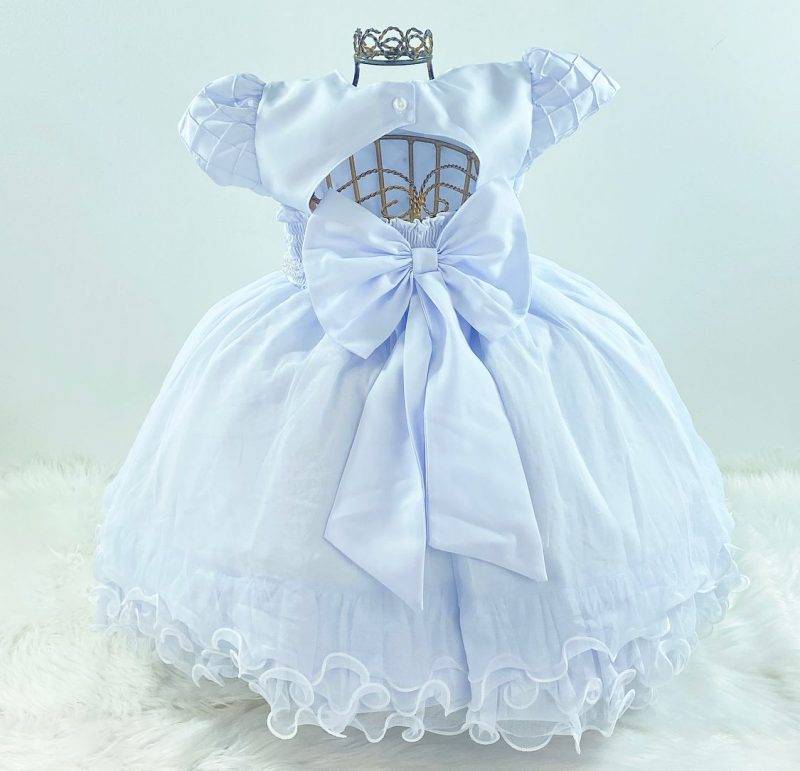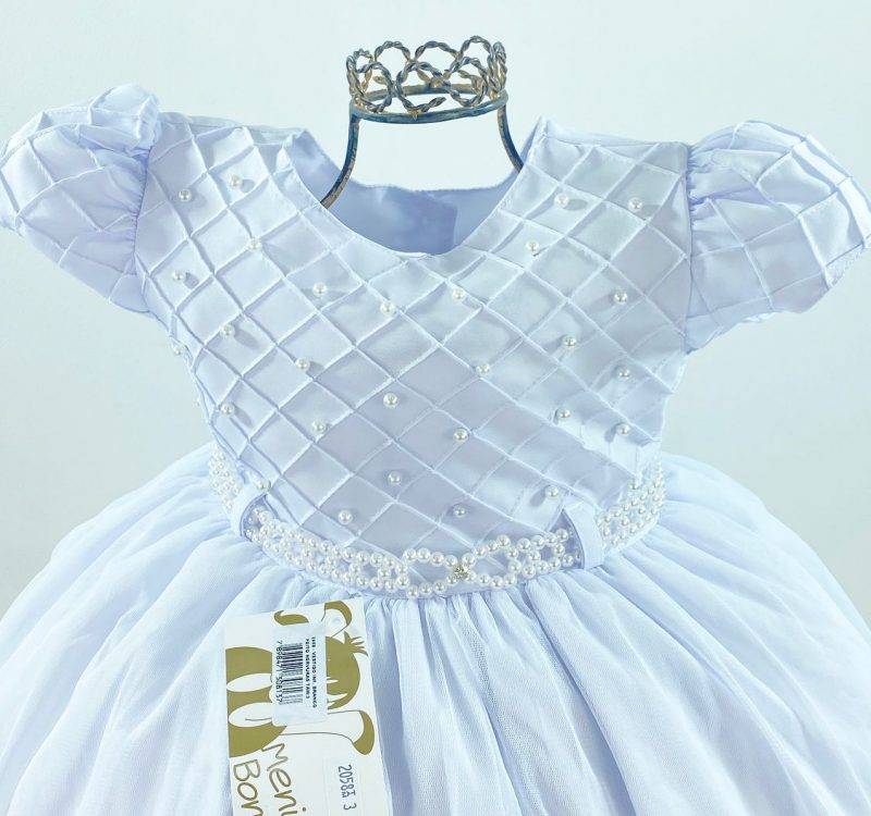 VESTIDO MANGA CURTA, PEITO QUADRICULADO NERVURA, BORDADO, CINTURA COM PÉROLAS SINTÉTICAS, SAIA TULE. ELÁSTICO NAS COSTAS AJUSTÁVEL AO CORPO E LAÇO. COR: BRANCO