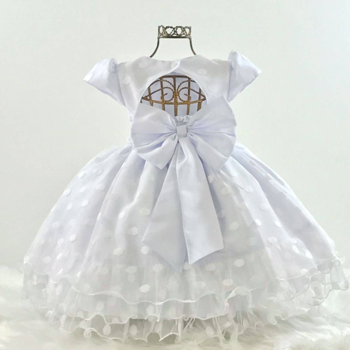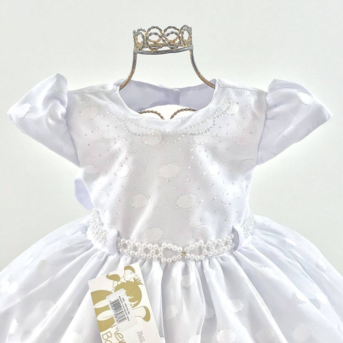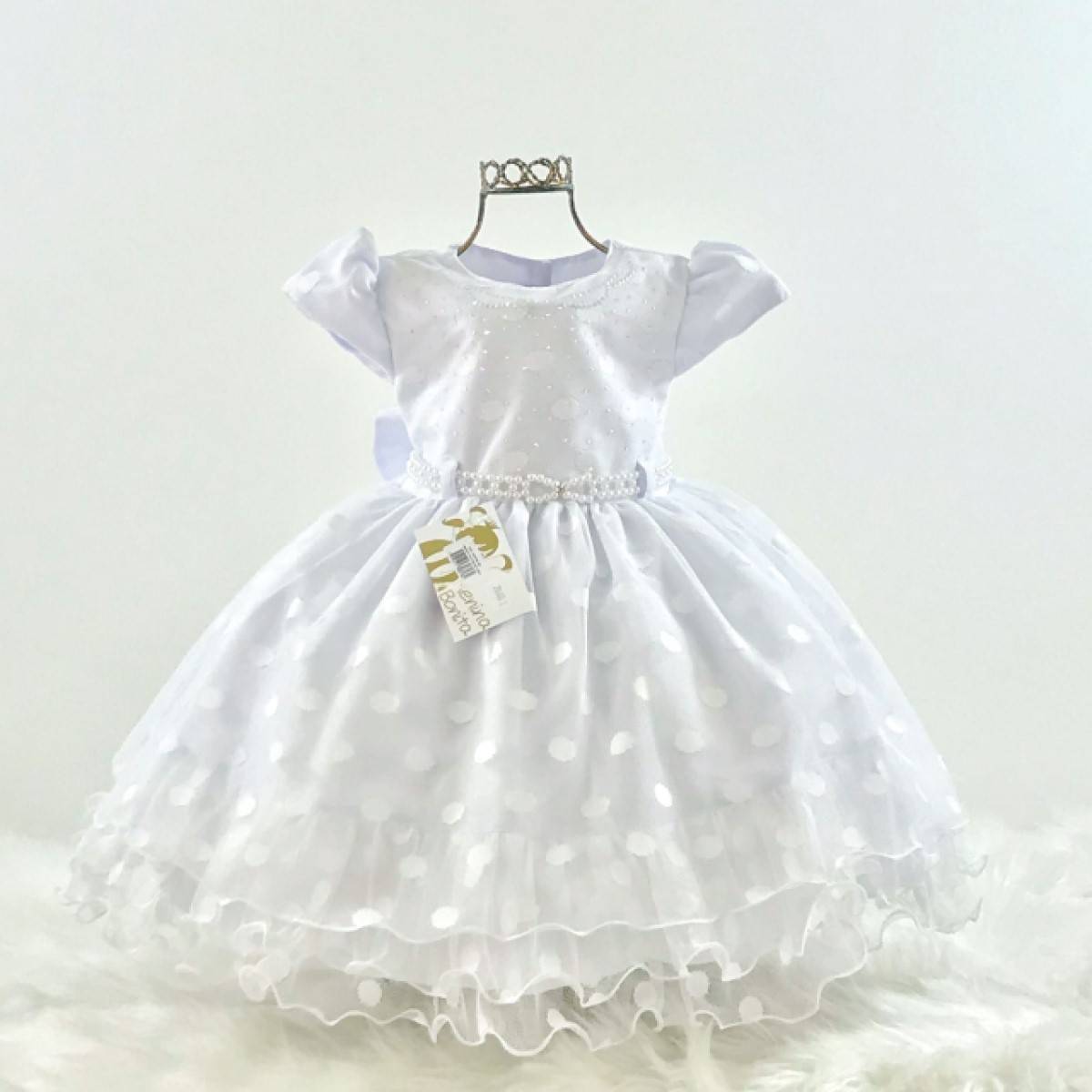VESTIDO MANGA CURTA COM FORRO, PEITO COM STRASS ,CINTURA PÉROLAS SINTÉTICAS. TULE BOLAS. LAÇO TRASEIRO ELÁSTICO NAS COSTAS AJUSTÁVEL AO CORPO. COR: BRANCO