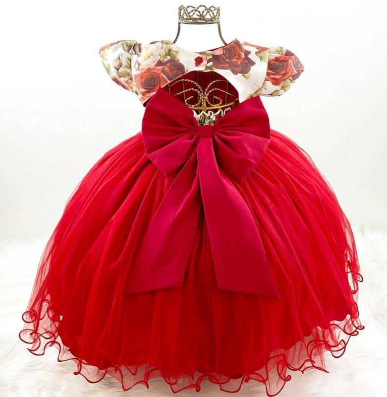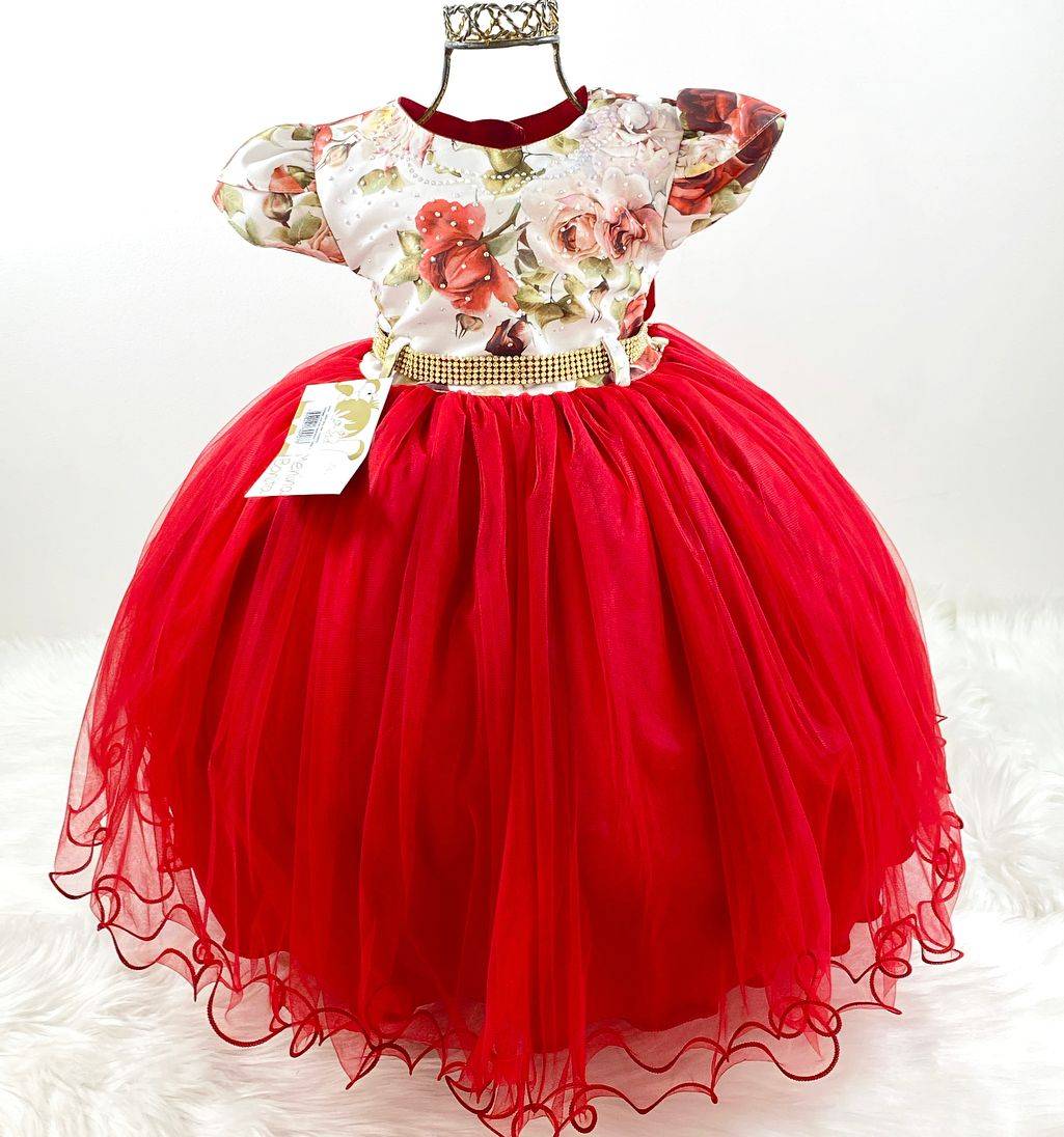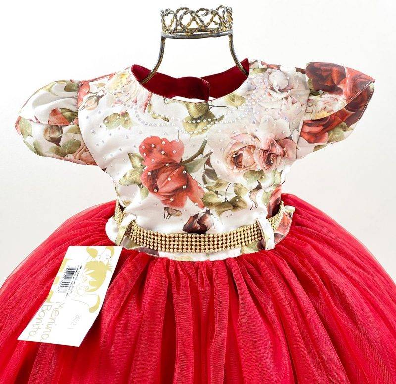 Vestido manga curta com forro, peito estampa floral com strass, saia voal tule vermelho, cintura com passante para cintinho de strass. Elástico nas costas ajustável ao corpo e laço.