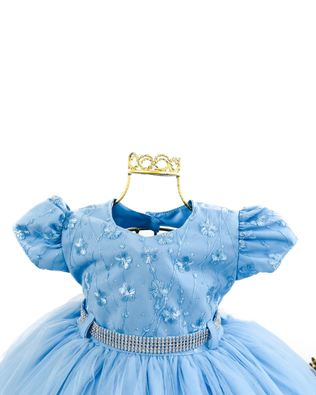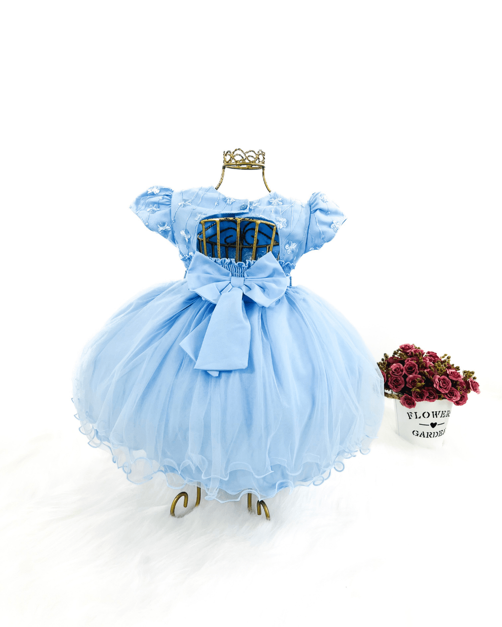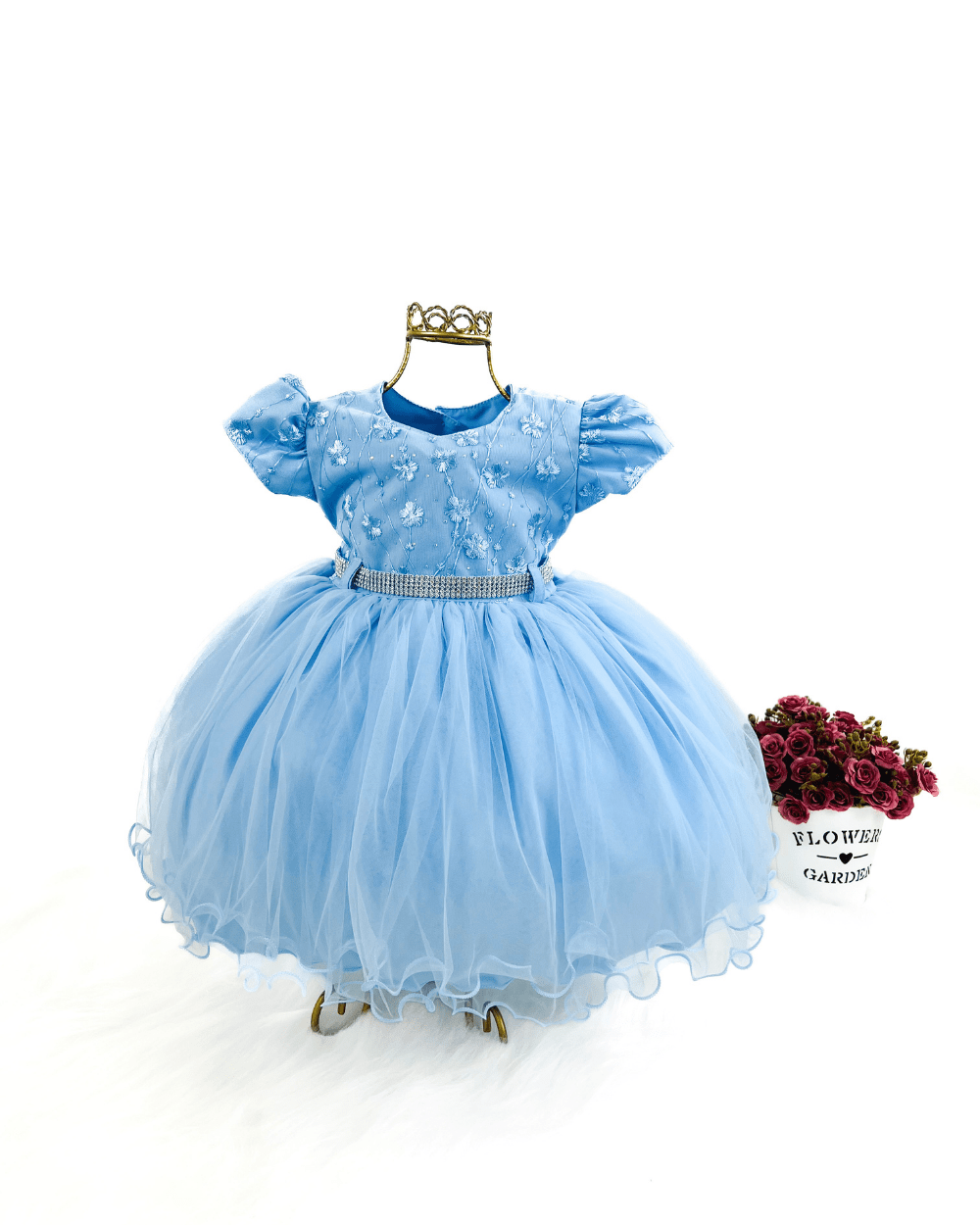 Vestido, Menina Bonita, manga curta, Detalhe em renda no peito e brilho, cinto trabalhado em strass, laço nas costas removível e costas semi fechada.