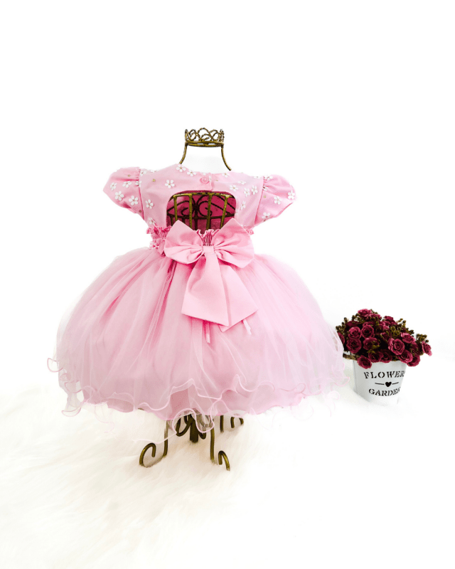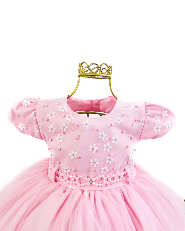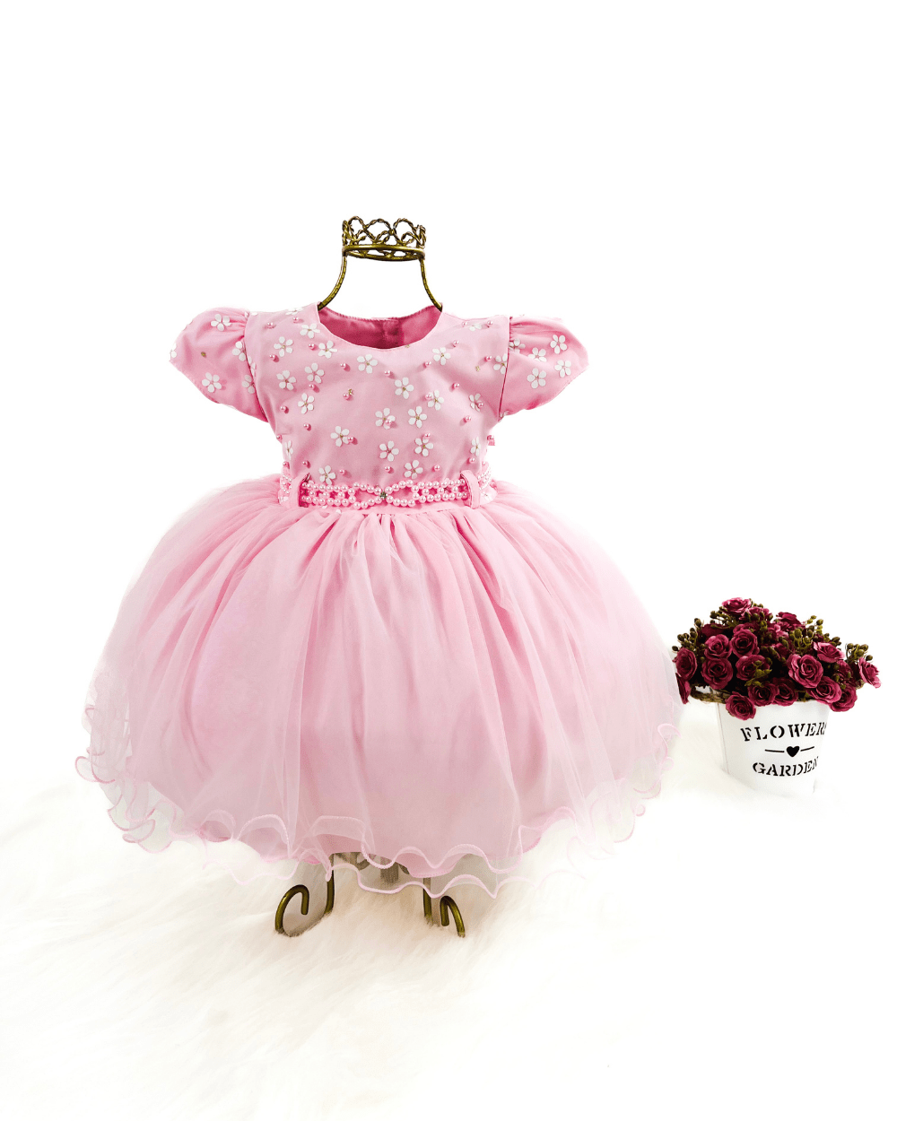 Vestido, Menina Bonita, manga curta, Detalhe em estampa de florzinhas no peito e pérolas, cinto também trabalhado em perolas, laço nas costas removível e costas semi fechada.