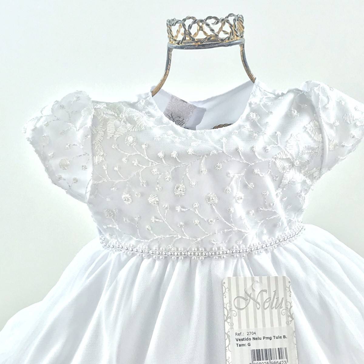VESTIDO MANGA CURTA, PEITO COM RENDA E PÉROLAS SINTÉTICAS , SAIA TULE - DISPONÍVEL NA COR: BRANCO