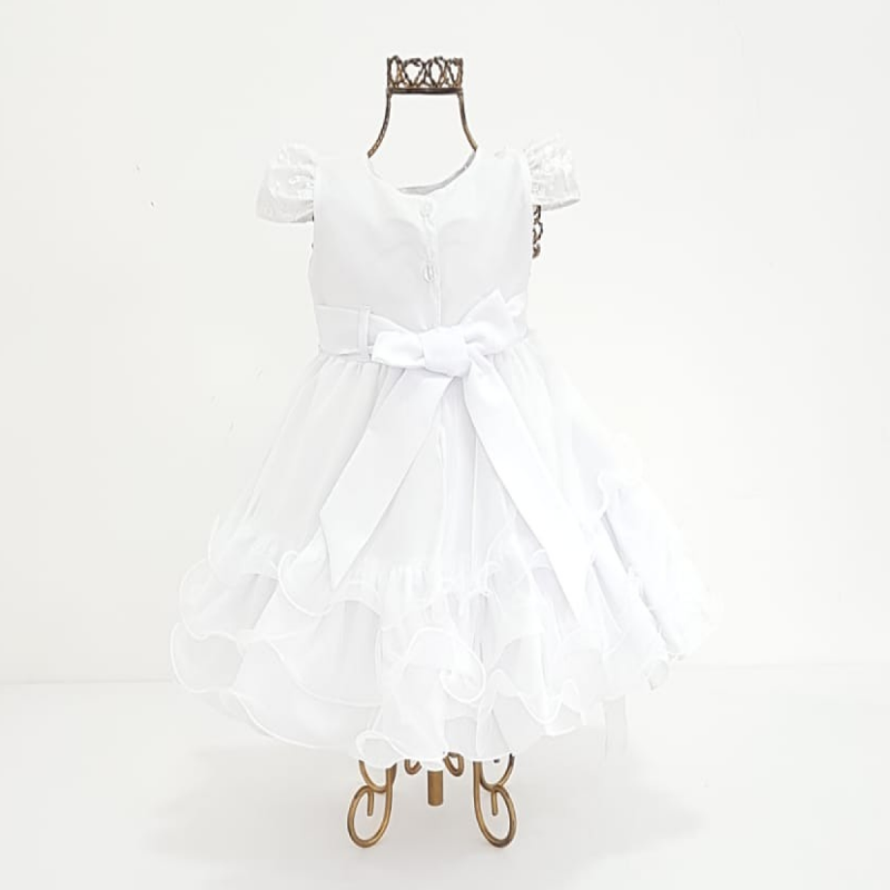 VESTIDO MANGA CURTA COM FORRO, PEITO COM RENDA, BORDADO COM PÉROLAS SINTÉTICAS ,SAIA TULE. BOTÕES NAS COSTAS.