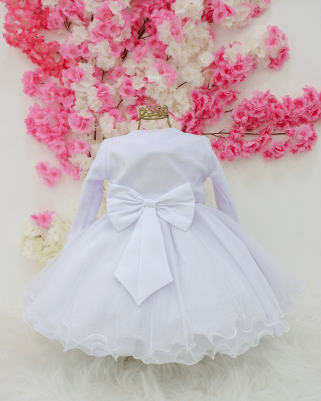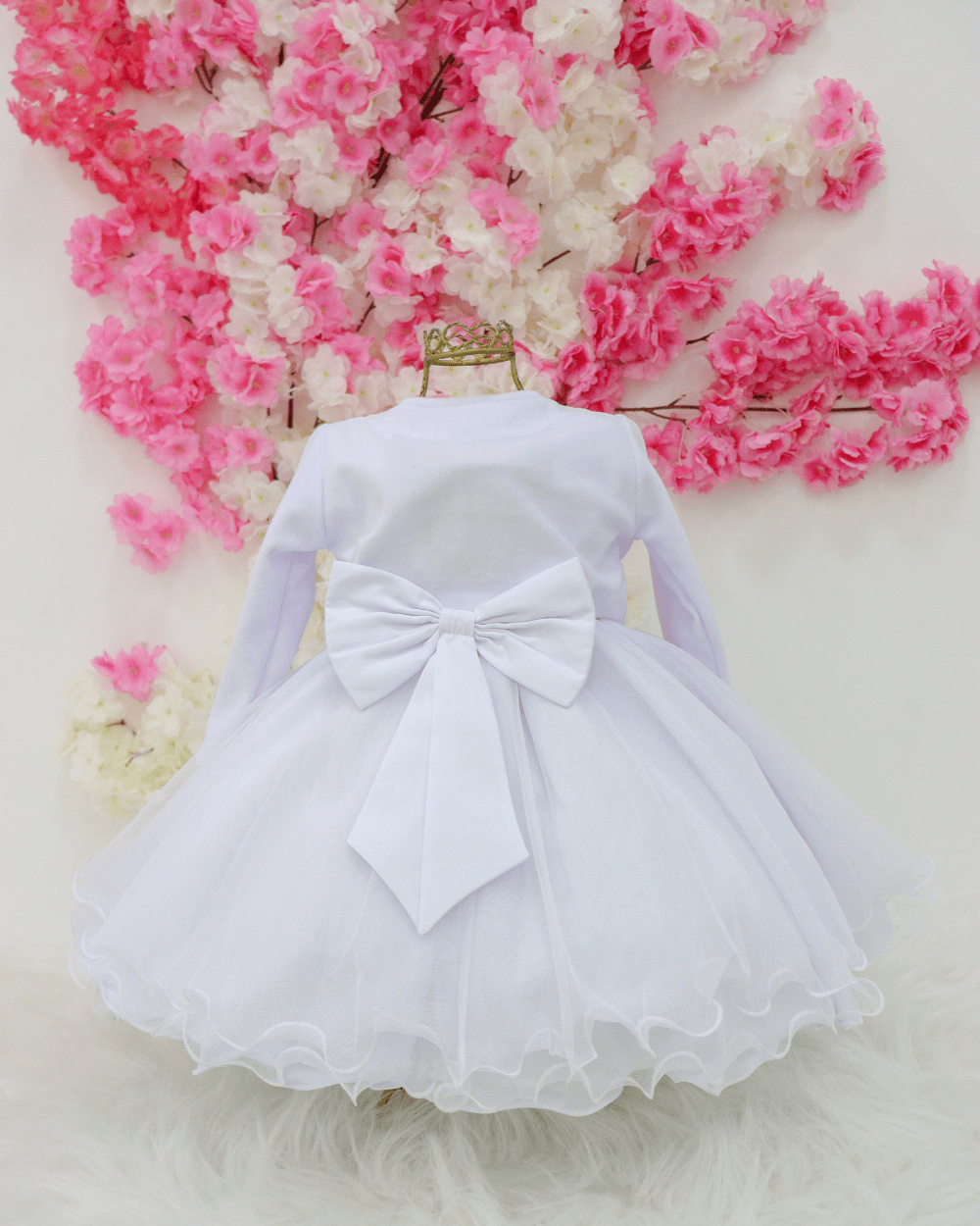 Vestido Nelu, vestido regata com com bolero, peito rendado, saia de em tule costas semi aberta e laço removível.
