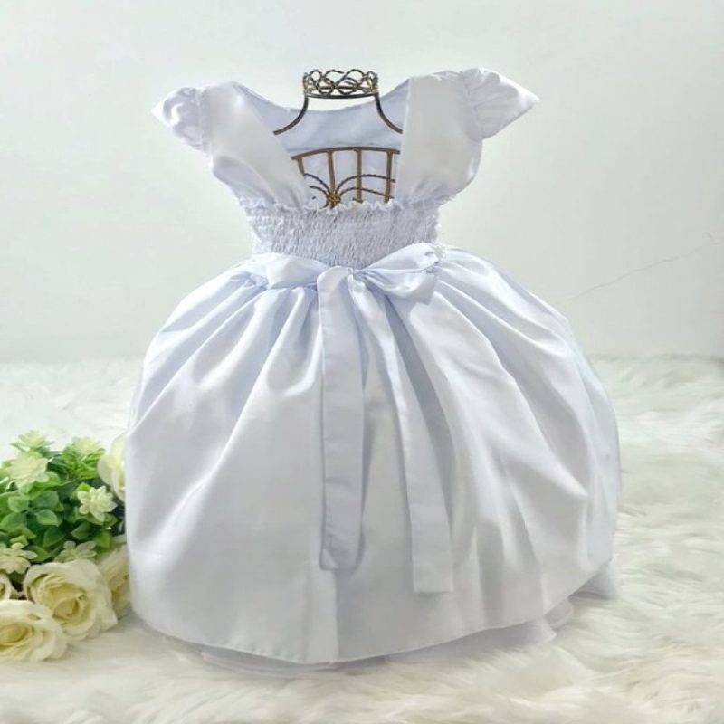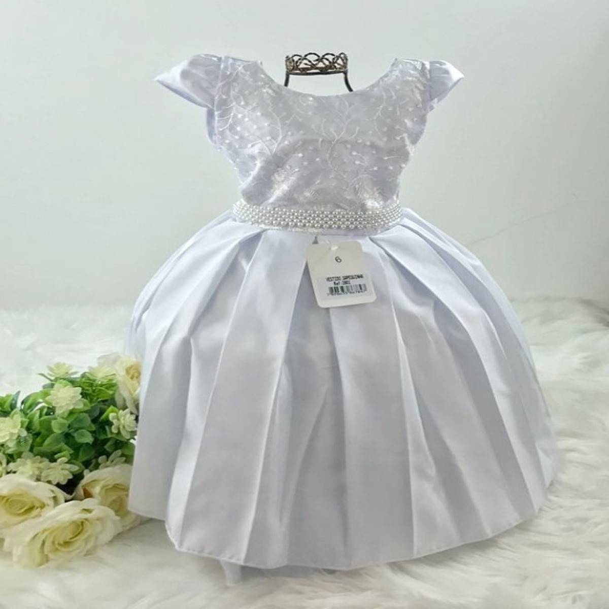 Vestido infantil manga curta ,peito com renda ,cintura com cintinhode pérolas sintéticas branca, saia lisa tule ,elástico nas costas ajustável ao corpo.