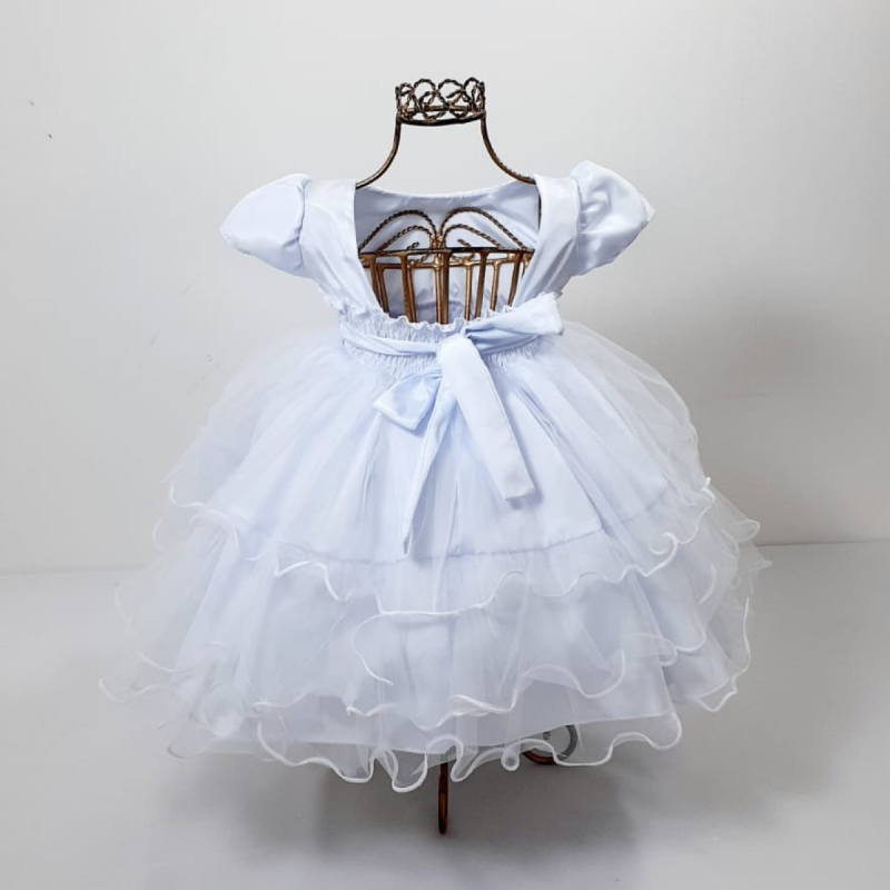 VESTIDO MANGA CURTA ,PEITO COM RENDA,CINTO DE PÉROLAS SINTÉTICAS ,SAIA BABADOS TULE ,ELÁSTICO NAS COSTAS AJUSTÁVEL AO CORPO, LAÇO TRASEIRO- COR:BRANCO