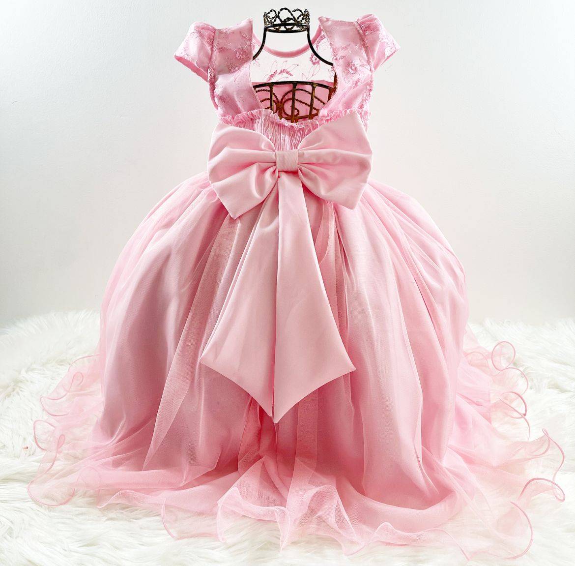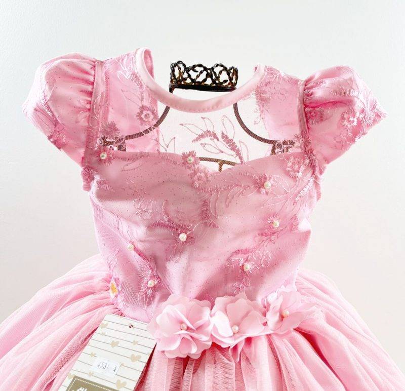 Vestido infantil manga curta, peito com renda gola com transparência, saia lisa acabamento simples . Cintura com bordado de pérolas sintéticas. Nas costas contém elástico ajustável ao corpo e faixa.